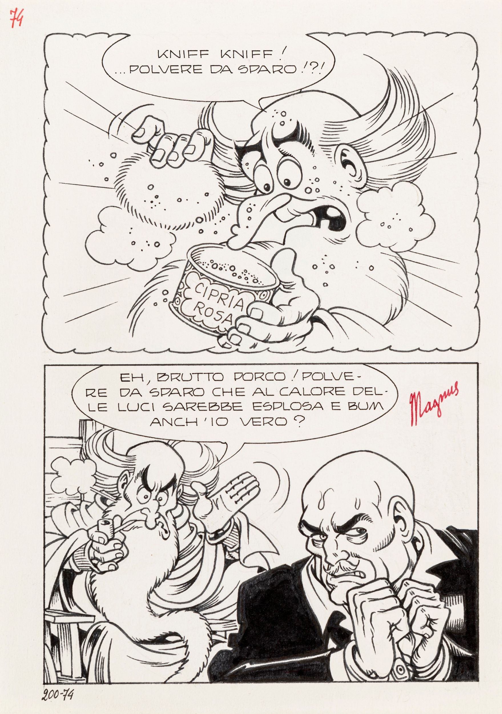 matita e china su cartoncino, 17,5 x 25 cm 1986 Tavola originale realizzata da Magnus per lo storico numero 200 di Alan Ford Hic Hic Hurrà, edita a pag. 74 dalla Editoriale Corno nel 1986. Dopo undici anni dall'abbandono della testata, Magnus torna a realizzare questo storico albo in cui viene finalmente svelata la presunta morte del Numero Uno. Firmata.