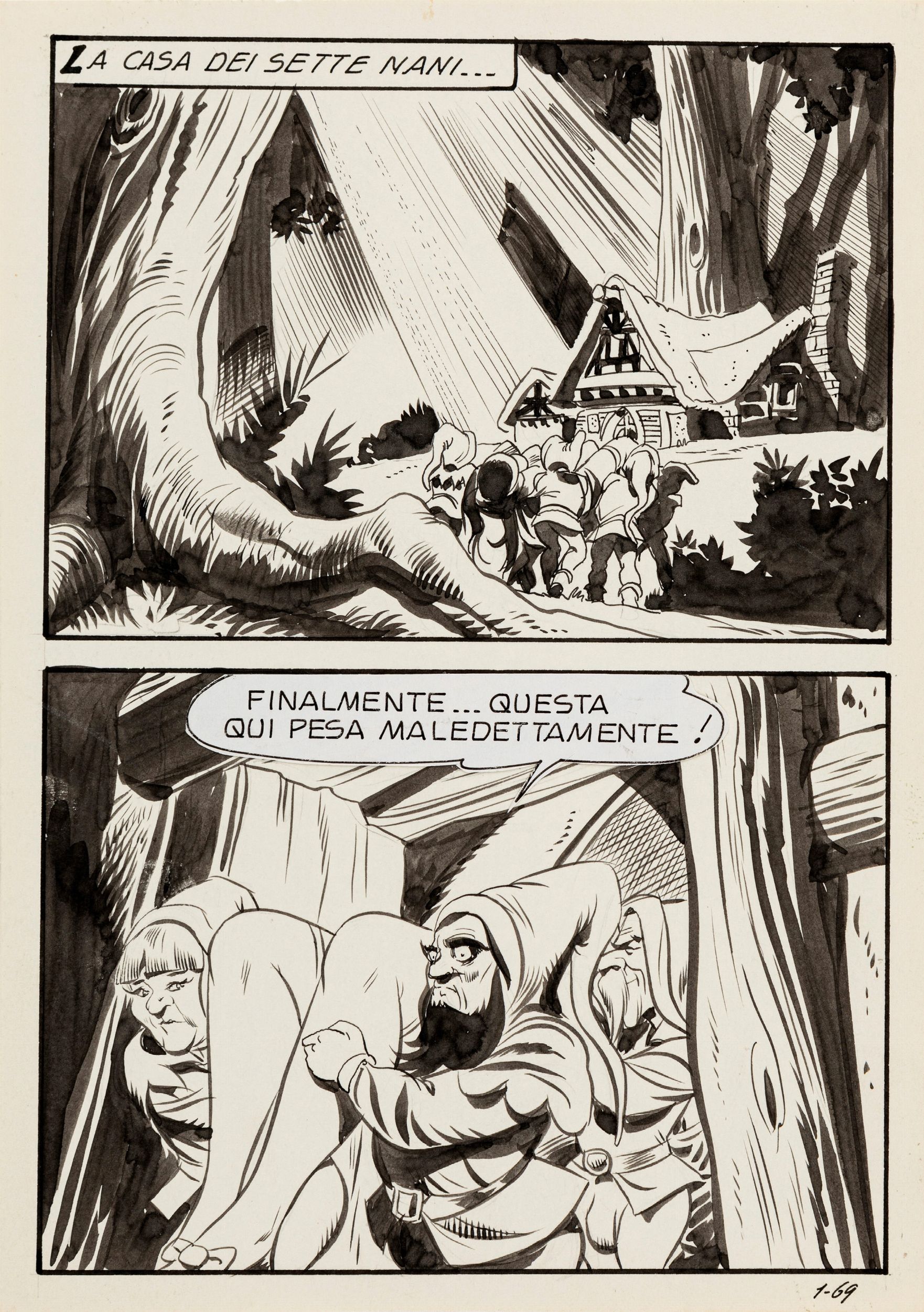 1972 Tavola originale realizzata da Frollo per I Sette Nani viziosi, lo storico primo numero della sua Biancaneve, edita a pag. 69 dalla Edifumetto nel 1972. Basata sull'omonima fiaba, racconta le vicende dell'ingenua protagonista che viene iniziata alle gioie del sesso dai sette nani; la serie racconta le avventure sessuali di Biancaneve in un mondo di principi, regine e mostri, riuscendo a restare vergine sotto continui assalti sessuali per i primi quattro episodi, per poi divenire la principessa del sesso libero e gioioso per tutti. A dieci anni esatti dalla nascita di Diabolik e del fumetto nero, si consuma nelle edicole italiane una nuova rivoluzione, da una intuizione di Renzo Barbieri nasce Biancaneve, suscitando grande scalpore e sconcerto sull'opinione pubblica. Biancaneve rivoluzionerà il modo di intendere e usufruire del fumetto, stravolgendo i luoghi comuni e gli stereotipi della società dell'epoca, inserendo nelle storie una provocante satira sociale e una, non velata, denuncia alla società bigotta, moralista e conservatrice, creando così un nuovo genere: le Sexy Favole per adulti.