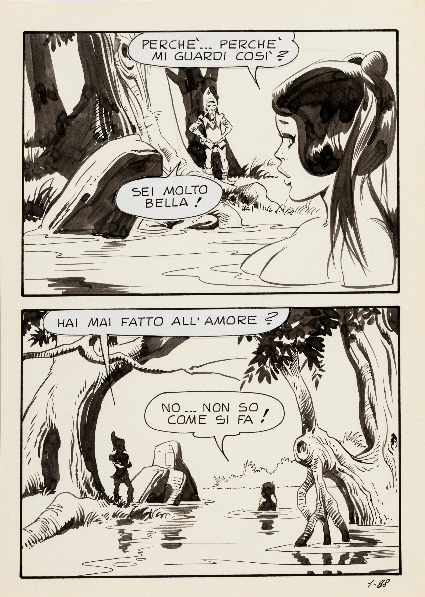 1972 Tavola originale realizzata da Frollo per I Sette Nani viziosi, lo storico primo numero della sua Biancaneve, edita a pag. 88 dalla Edifumetto nel 1972. Basata sull'omonima fiaba, racconta le vicende dell'ingenua protagonista che viene iniziata alle gioie del sesso dai sette nani; la serie racconta le avventure sessuali di Biancaneve in un mondo di principi, regine e mostri, riuscendo a restare vergine sotto continui assalti sessuali per i primi quattro episodi, per poi divenire la principessa del sesso libero e gioioso per tutti. A dieci anni esatti dalla nascita di Diabolik e del fumetto nero, si consuma nelle edicole italiane una nuova rivoluzione, da una intuizione di Renzo Barbieri nasce Biancaneve, suscitando grande scalpore e sconcerto sull'opinione pubblica. Biancaneve rivoluzionerà il modo di intendere e usufruire del fumetto, stravolgendo i luoghi comuni e gli stereotipi della società dell'epoca, inserendo nelle storie una provocante satira sociale e una, non velata, denuncia alla società bigotta, moralista e conservatrice, creando così un nuovo genere: le Sexy Favole per adulti.
