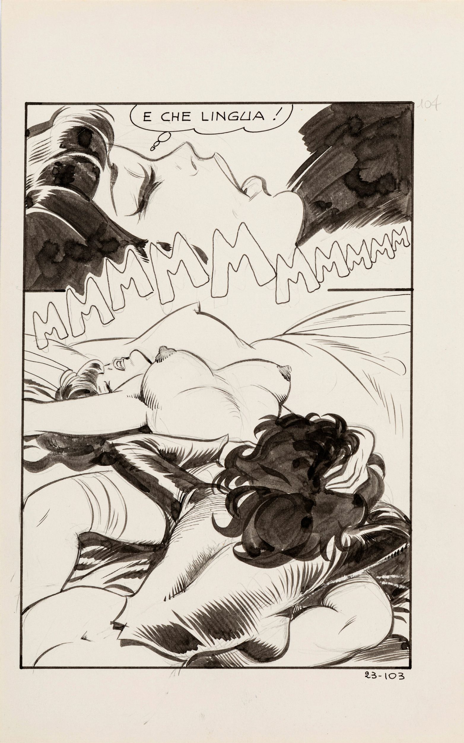 1974 Tavola originale realizzata da Frollo per Le avventure di Ditalina, edita su Biancaneve n. 23 a pag. 103 dalla Edifumetto nel 1974. Basata sull'omonima fiaba, racconta le vicende dell'ingenua protagonista che viene iniziata alle gioie del sesso dai sette nani; la serie racconta le avventure sessuali di Biancaneve in un mondo di principi, regine e mostri, riuscendo a restare vergine sotto continui assalti sessuali per i primi quattro episodi, per poi divenire la principessa del sesso libero e gioioso per tutti. A dieci anni esatti dalla nascita di Diabolik e del fumetto nero, si consuma nelle edicole italiane una nuova rivoluzione, da una intuizione di Renzo Barbieri nasce Biancaneve, suscitando grande scalpore e sconcerto sull'opinione pubblica. Biancaneve rivoluzionerà il modo di intendere e usufruire del fumetto, stravolgendo i luoghi comuni e gli stereotipi della società dell'epoca, inserendo nelle storie una provocante satira sociale e una, non velata, denuncia alla società bigotta, moralista e conservatrice, creando così un nuovo genere: le Sexy Favole per adulti.