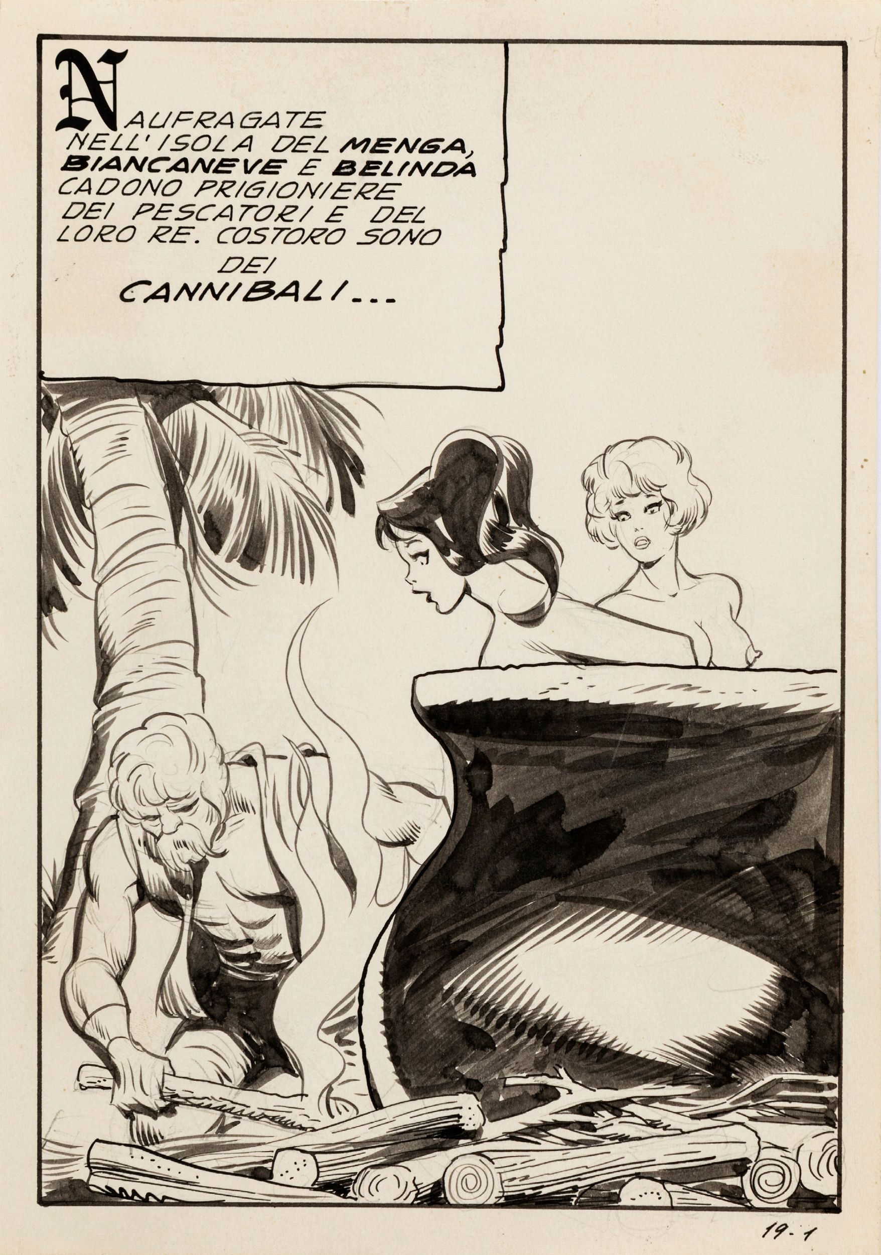 1974 Tavola originale realizzata da Frollo per Robinson Culoè, edita su Biancaneve n. 19 a pag. 1 dalla Edifumetto nel 1974. Basata sull'omonima fiaba, racconta le vicende dell'ingenua protagonista che viene iniziata alle gioie del sesso dai sette nani; la serie racconta le avventure sessuali di Biancaneve in un mondo di principi, regine e mostri, riuscendo a restare vergine sotto continui assalti sessuali per i primi quattro episodi, per poi divenire la principessa del sesso libero e gioioso per tutti. A dieci anni esatti dalla nascita di Diabolik e del fumetto nero, si consuma nelle edicole italiane una nuova rivoluzione, da una intuizione di Renzo Barbieri nasce Biancaneve, suscitando grande scalpore e sconcerto sull'opinione pubblica. Biancaneve rivoluzionerà il modo di intendere e usufruire del fumetto, stravolgendo i luoghi comuni e gli stereotipi della società dell'epoca, inserendo nelle storie una provocante satira sociale e una, non velata, denuncia alla società bigotta, moralista e conservatrice, creando così un nuovo genere: le Sexy Favole per adulti.