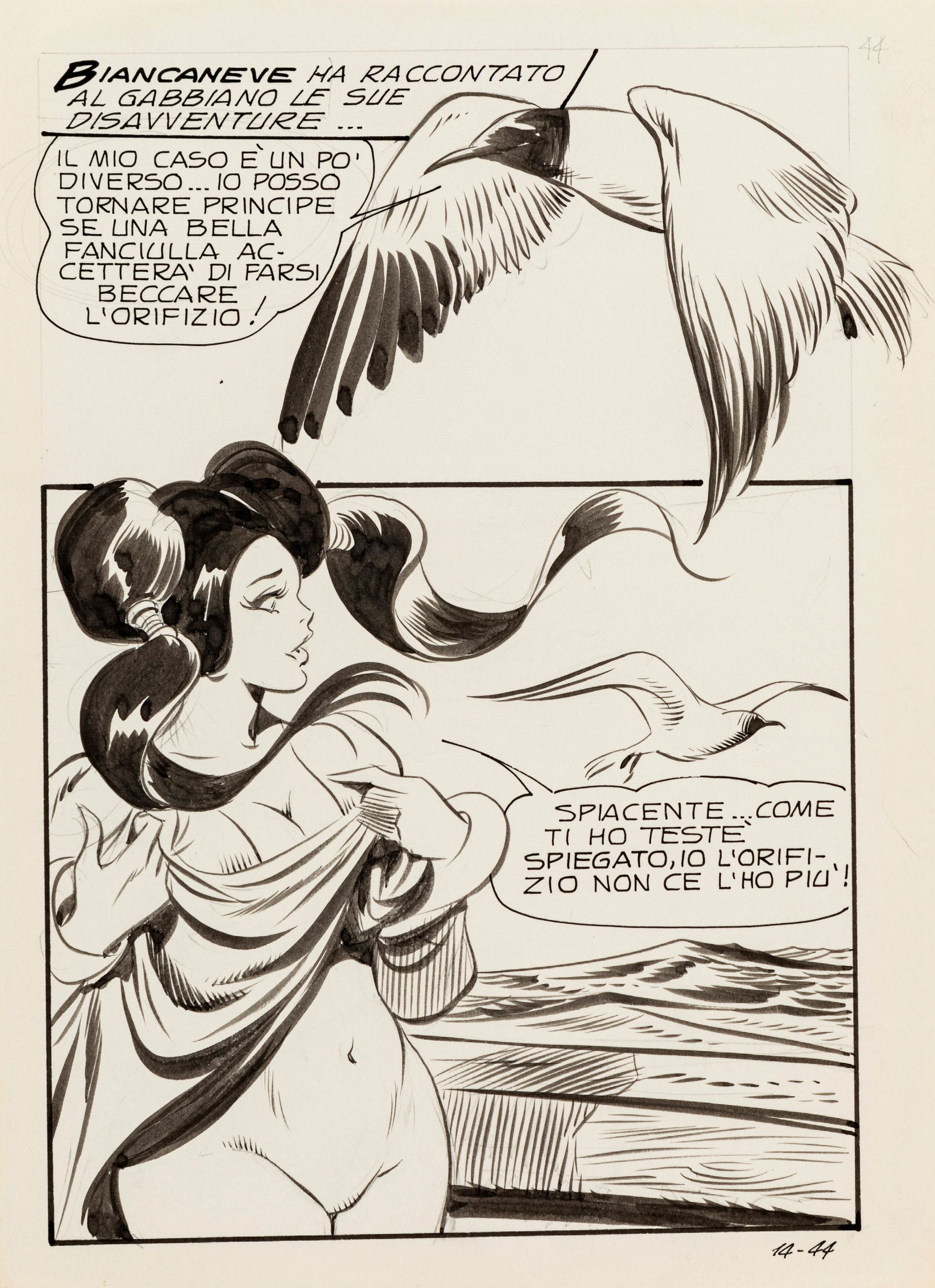 1973 Tavola originale realizzata da Frollo per Senza Bernarda, edita su Biancaneve n. 14 a pag. 44 dalla Edifumetto nel 1973. Basata sull'omonima fiaba, racconta le vicende dell'ingenua protagonista che viene iniziata alle gioie del sesso dai sette nani; la serie racconta le avventure sessuali di Biancaneve in un mondo di principi, regine e mostri, riuscendo a restare vergine sotto continui assalti sessuali per i primi quattro episodi, per poi divenire la principessa del sesso libero e gioioso per tutti. A dieci anni esatti dalla nascita di Diabolik e del fumetto nero, si consuma nelle edicole italiane una nuova rivoluzione, da una intuizione di Renzo Barbieri nasce Biancaneve, suscitando grande scalpore e sconcerto sull'opinione pubblica. Biancaneve rivoluzionerà il modo di intendere e usufruire del fumetto, stravolgendo i luoghi comuni e gli stereotipi della società dell'epoca, inserendo nelle storie una provocante satira sociale e una, non velata, denuncia alla società bigotta, moralista e conservatrice, creando così un nuovo genere: le Sexy Favole per adulti.