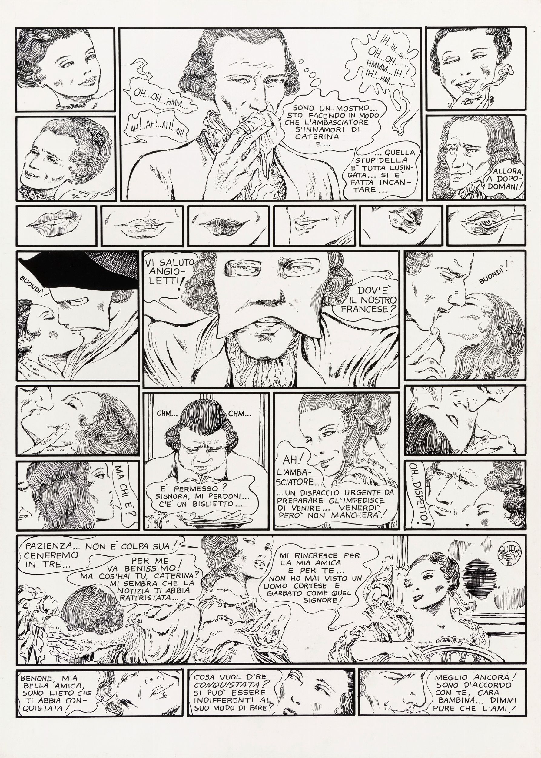 matita e china su cartone, 36,5 x 51 cm 1976 Tavola originale realizzata da Crepax per la pag. 19 di Casanova, storia tratta dal classico di Giacomo Casanova pubblicato per la prima volta in volume da Franco Maria Ricci nel 1977. In questa trasposizione della vita del celebre libertino nella Venezia del settecento, Crepax pone in primo piano la psicologia del protagonista quanto le sue licenziose avventure, presentando Casanova tra sfrenato erotismo e momenti di riflessione e sofferenza. Firmata e datata.