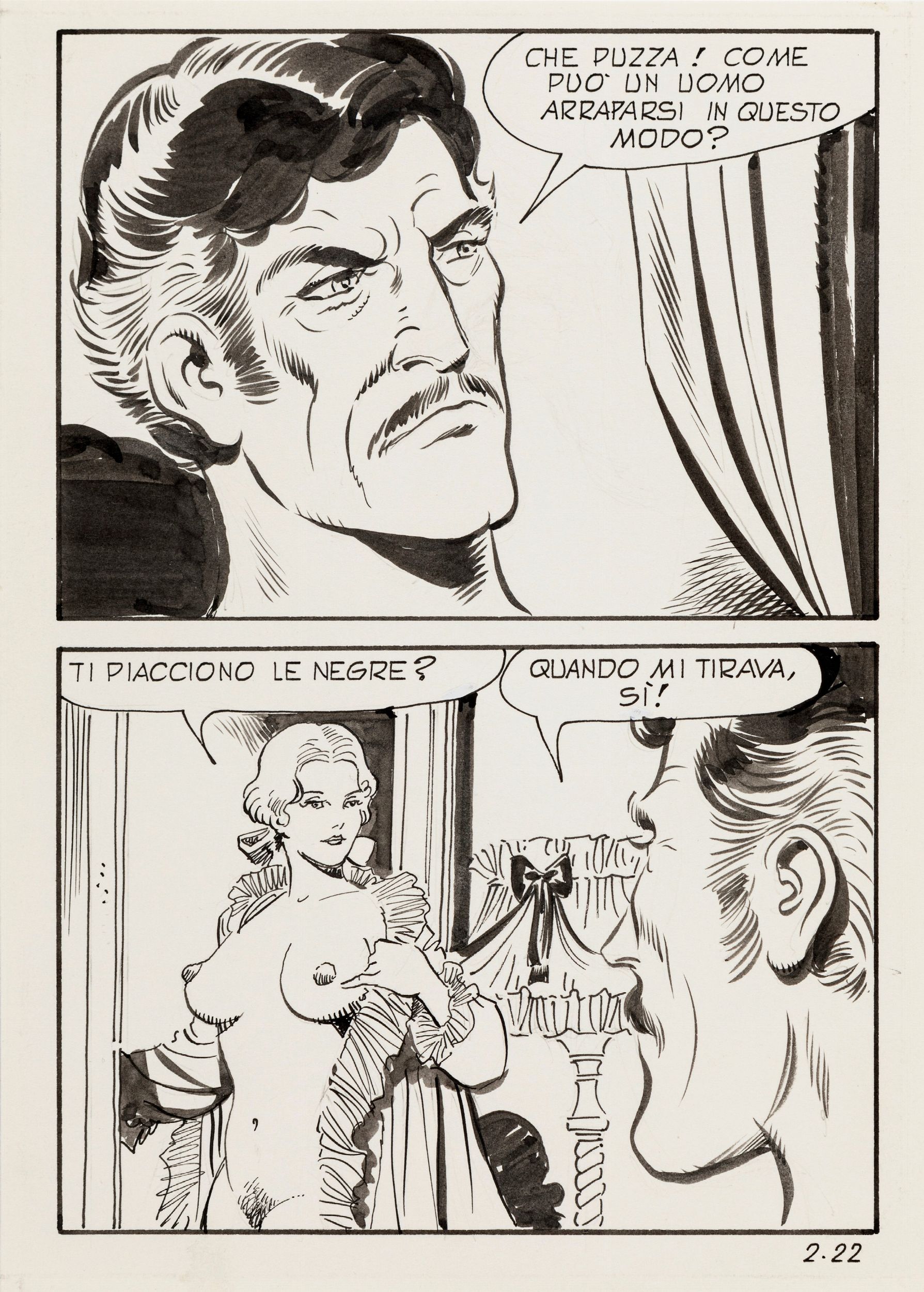 matita e china su cartoncino, 15 x 20,5 cm 1985 Tavola originale realizzata da Frollo per L'ultima vergine di Parigi, edita su Casino n. 2 a pag. 22 dalla Edifumetto nel 1985. Siamo nella Parigi del 1898. Madame Con gestisce la Maison Bianche, una rinomata casa di tolleranza dove splendide e disinibite ragazze sono pronte a compiacere esigenti clienti dai gusti particolari. Storie che spaziano nelle predilezioni erotiche più bizzarre, dove l'abilità grafica e il gusto di Leone Frollo hanno modo di esprimersi al meglio inscenando un erotismo elegante, con suggestioni tra liberty e belle époque.