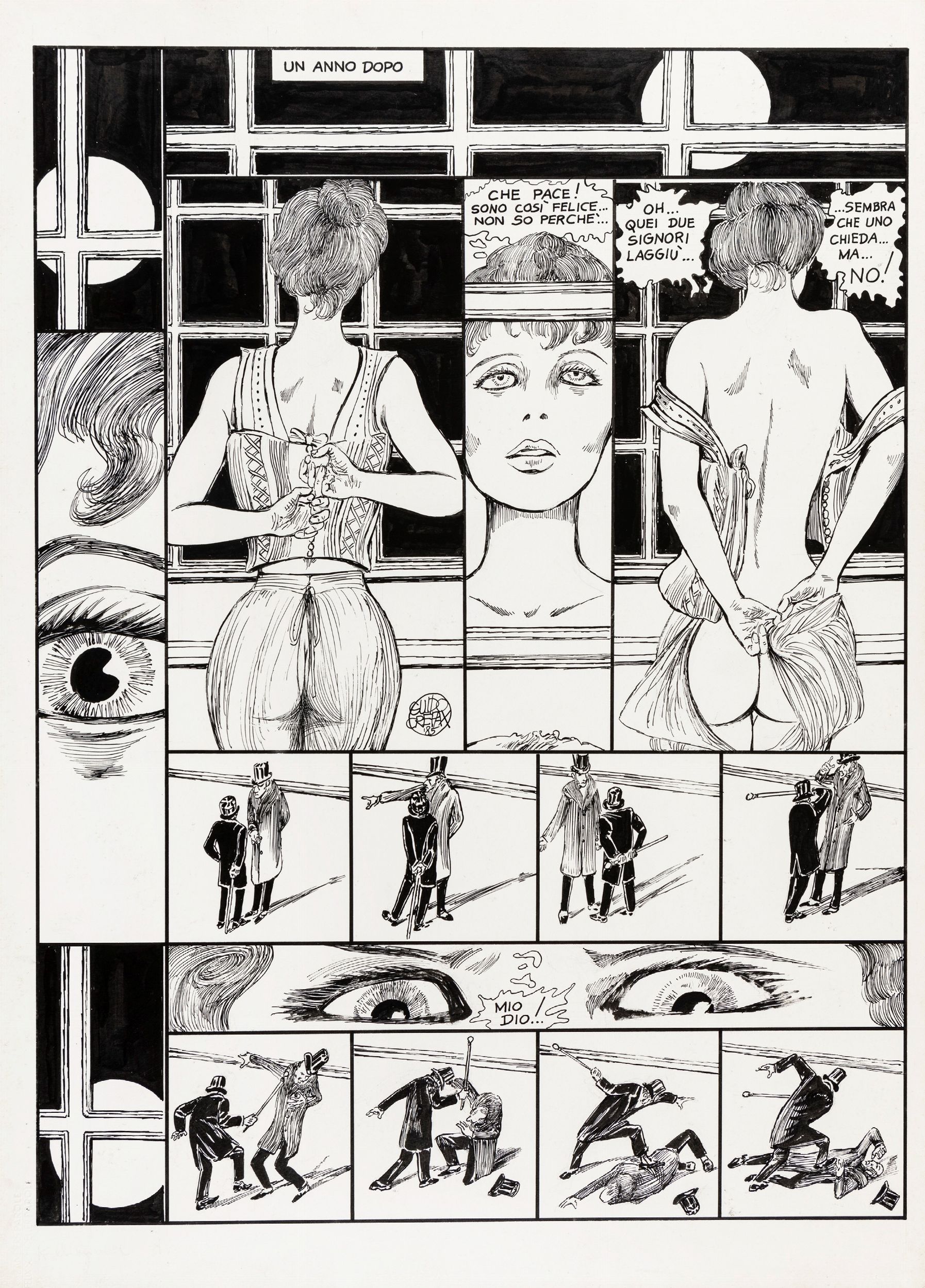 matita e china su cartone, 36,5 x 51 cm 1985 Tavola originale realizzata da Crepax per la pag. 11 di Dr. Jekyll e Mr. Hyde, trasposizione del classico di Robert Louis Stevenson pubblicato per la prima volta in volume da Olympia Press nel 1987. La pagina da noi presentata è stata pubblicata in quarta di copertina nel volume Jekyll: La perversione dei mostri all‘interno della collana Erotica n. 18 dalla Mondadori nel 2015. In questa tavola dal forte taglio cinematografico, Crepax mette in scena il primo efferato omicidio di Mr. Hyde creando un incredibile senso di inquietudine e orrore tramite gli occhi terrorizzati della giovane testimone. Firmata e datata.