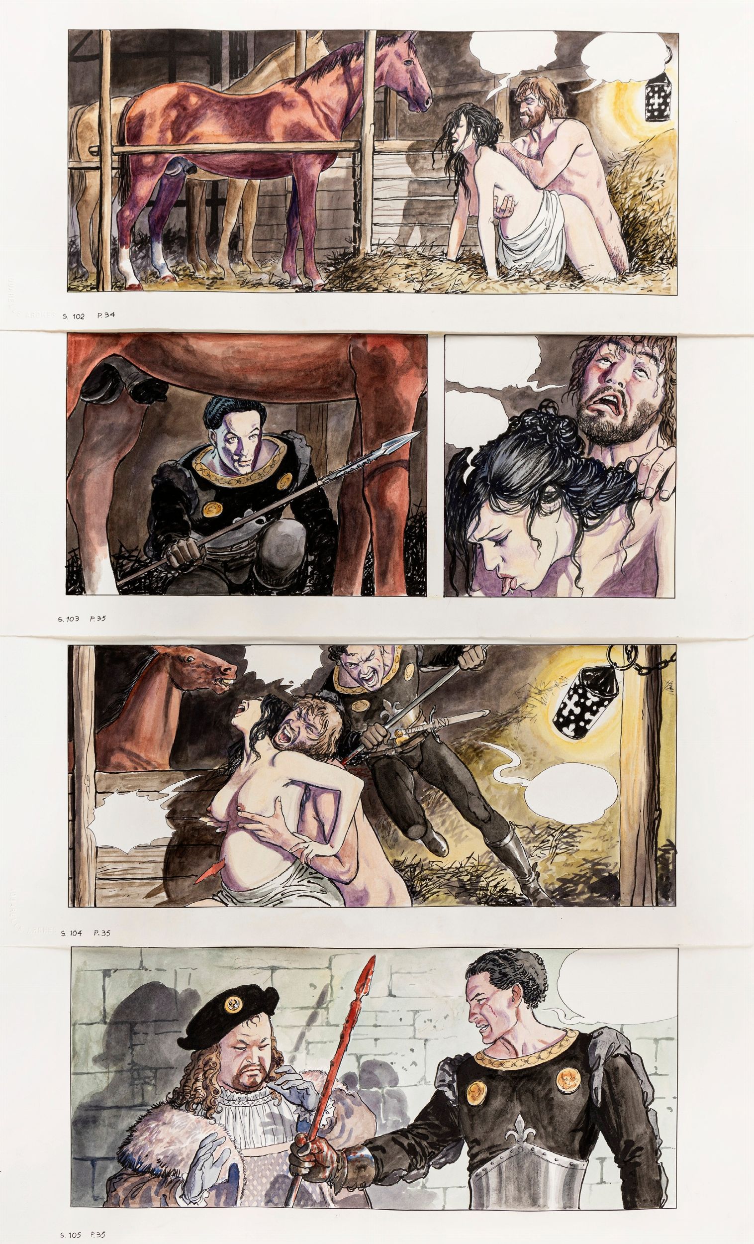 matita, china e acquerello su cartoncino, 57,5 x 94 cm 2006 Tavola originale composta dalla sequenza di 4 strisce (n. 102 - 103 - 104 - 105) realizzate da Manara per I Borgia: Il Potere e l'incesto, edita alle pagg. 34 e 35 del vol. 2 dalla Mondadori nel 2006. Sui testi di Alejandro Jodorowsky, Manara affresca una saga dalla grande componente erotico-shakspeariana narrando, tramite aneddoti e leggende, gli intrighi, le passioni e i più perversi segreti della famiglia Borgia e di papa Alessandro VI. Su quattro pannelli.