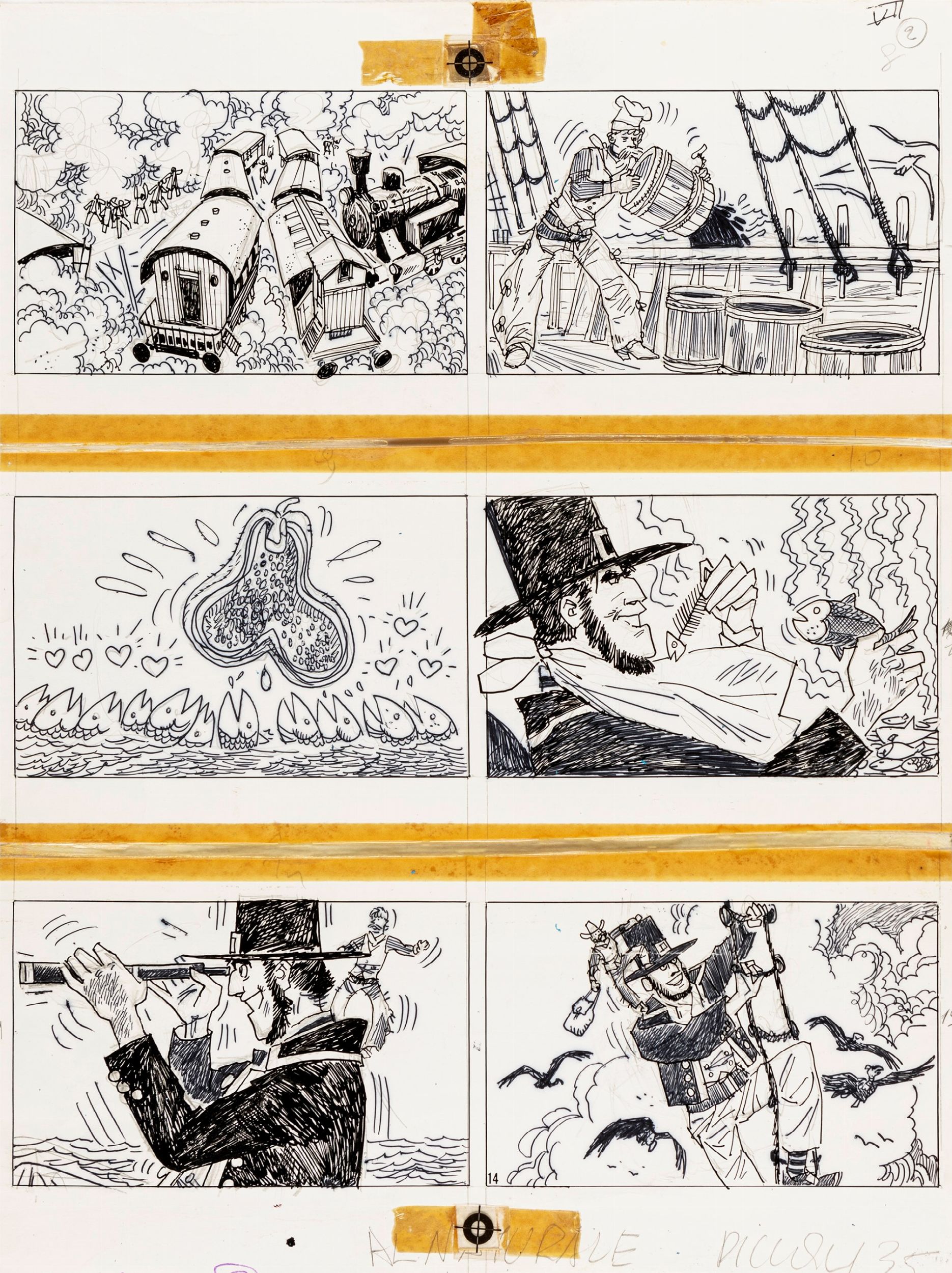 matita e china su cartoncino, 26 x 35,5 cm 1964 Tavola originale realizzata da Pratt per Il favoloso West: I giganti burloni, pag. 14 di questa ballata folk pubblicata per la prima volta sul C.d.P n. 32 nel 1964. Su tre pannelli. Colorata al retro a tempera.