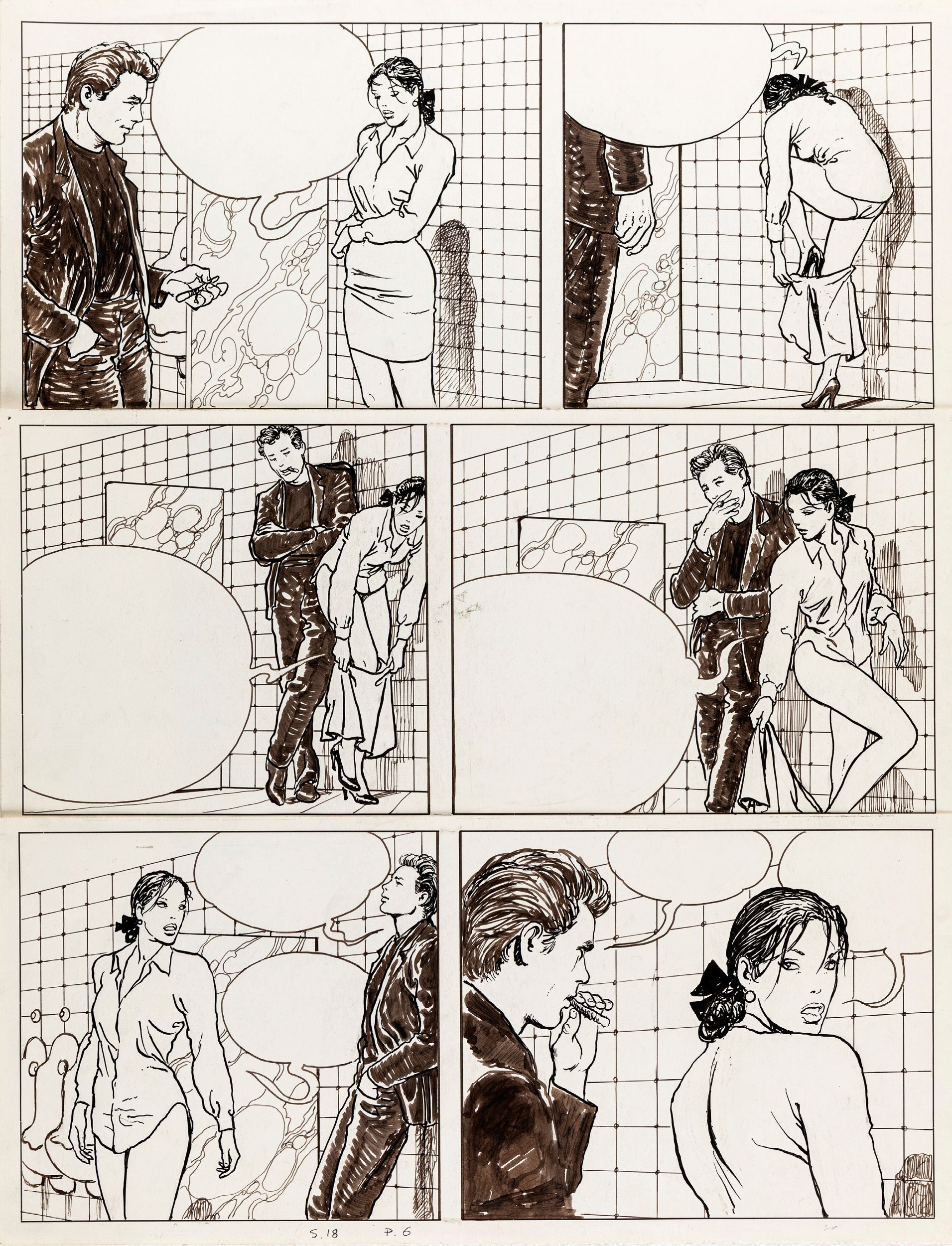 matita e china su cartoncino, 48 x 63 cm 1991 Tavola originale realizzata da Manara per Il gioco 2, pag. 6 del secondo capitolo della saga erotica più celebre del maestro veronese, pubblicata per la prima volta in Francia con il titolo Le déclic 2 da Albin Michel nel 1991 e successivamente ristampata in tutto il mondo. Su tre pannelli. Di grande rarità.