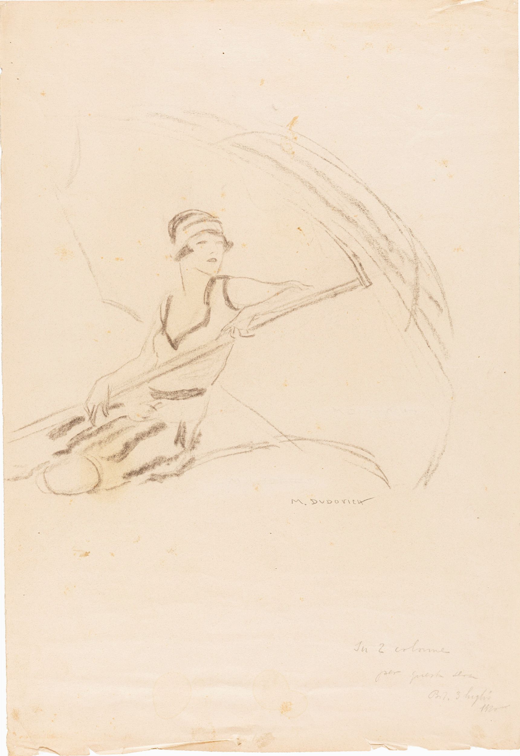 matita e carboncino su cartoncino, 32,5 x 48,5 cm 1919 Illustrazione originale realizzata da Dudovich tra il 1919 e il 1921 per le pagine de Il Resto del Carlino di Bologna dove i grandi magazzini La Rinascente promuovevano i propri capi di abbigliamento. Opera pubblicata su Arti decorative 1895-1930 vol. 3 a pag. 71 da Banca Emiliana nel 1985. Provenienza: collezione Mario Missiroli (direttore Il Resto del Carlino Bologna). Fori di affissione ai margini, pieghe e piccoli strappi al margine inferiore. Firmata.