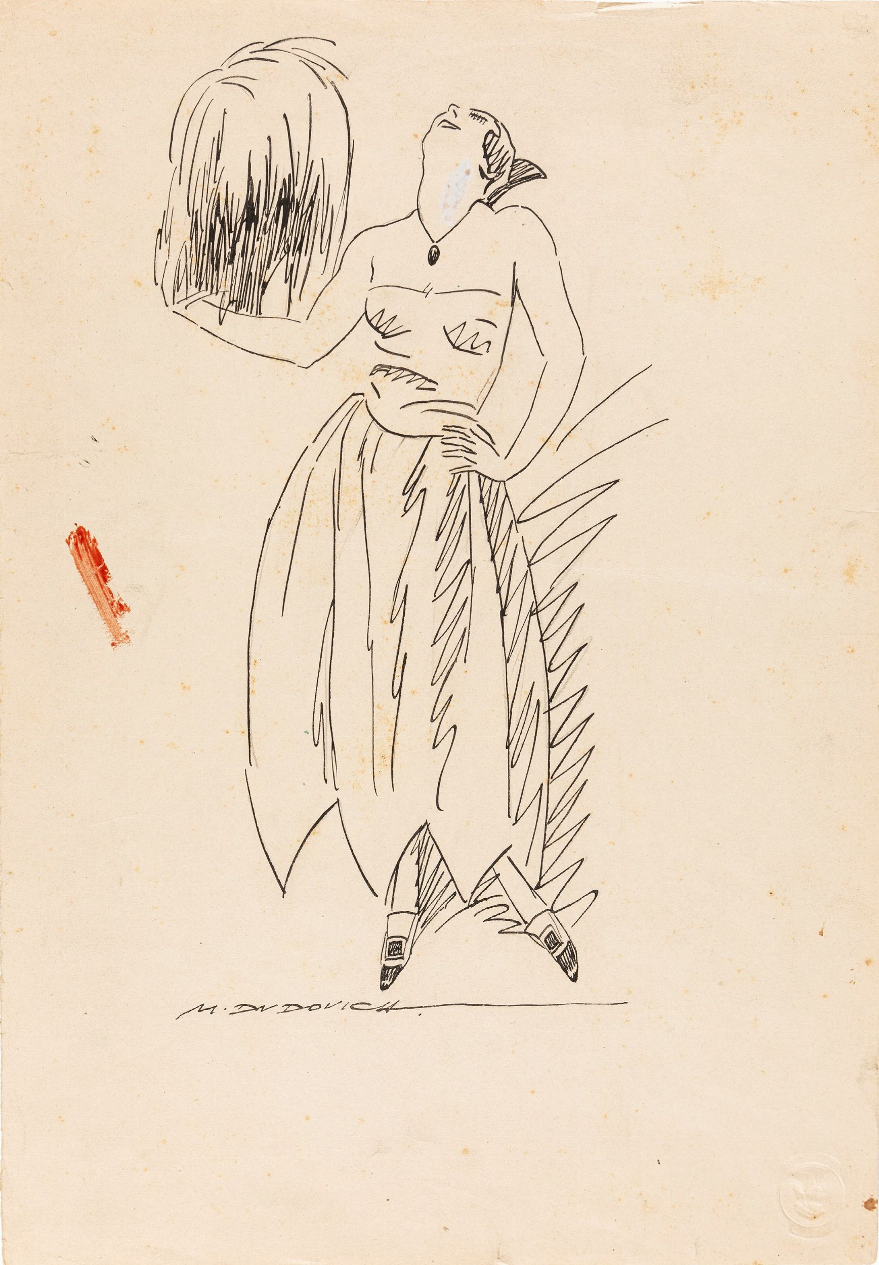 matita e carboncino su cartoncino, 32,5 x 48,5 cm 1919 Illustrazione originale realizzata da Dudovich tra il 1919 e il 1921 per le pagine de Il Resto del Carlino di Bologna dove i grandi magazzini La Rinascente promuovevano i propri capi di abbigliamento. Provenienza: collezione Mario Missiroli (direttore Il Resto del Carlino Bologna). Piccoli strappi ai margini. Firmata.