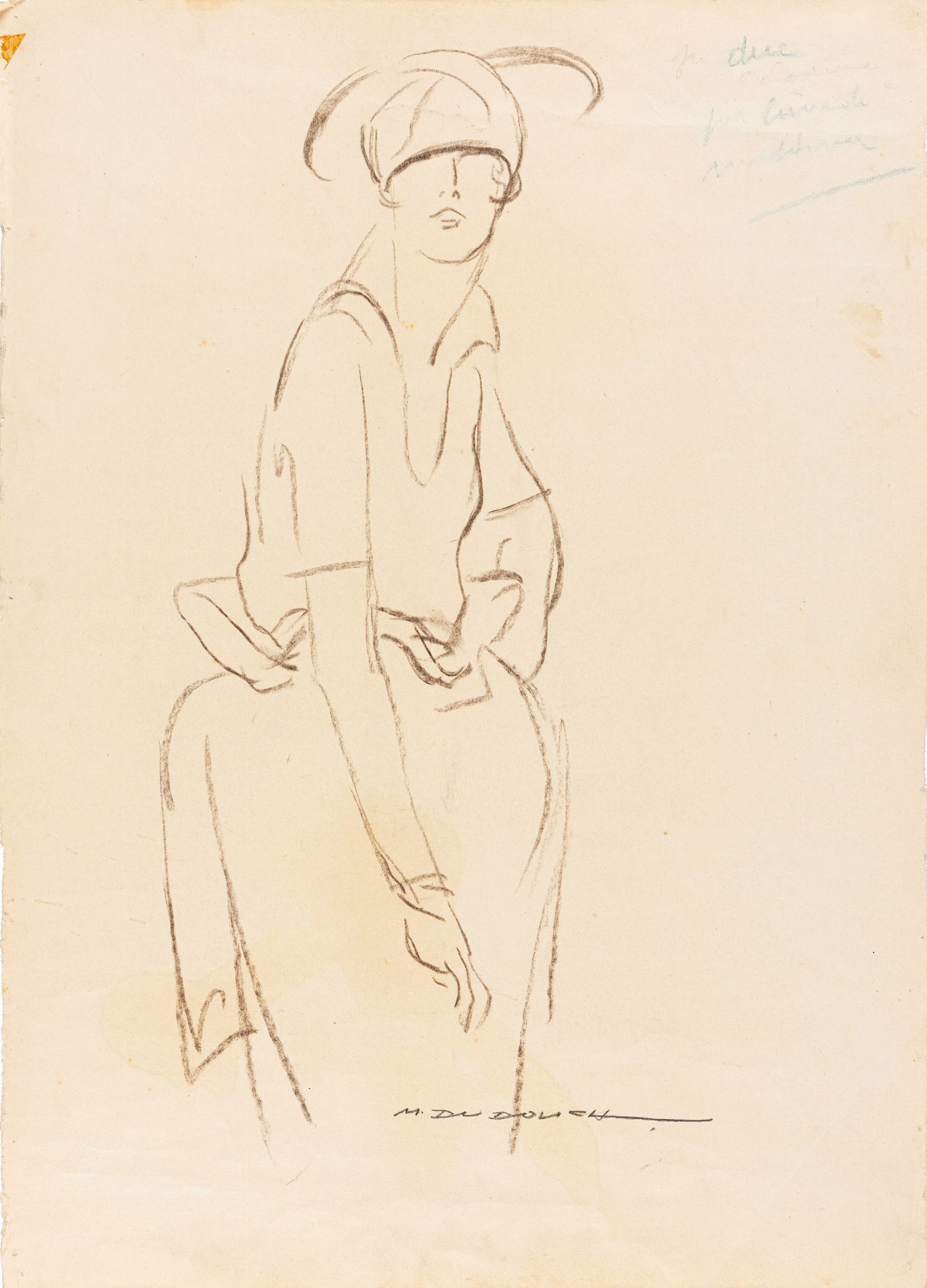 matita e carboncino su cartoncino, 32,5 x 48,5 cm 1919 Illustrazione originale realizzata da Dudovich tra il 1919 e il 1921 per le pagine de Il Resto del Carlino di Bologna dove i grandi magazzini La Rinascente promuovevano i propri capi di abbigliamento. Opera pubblicata su Arti decorative 1895-1930 vol. 3 a pag. 74 da Banca Emiliana nel 1985. Provenienza: collezione Mario Missiroli (direttore Il Resto del Carlino Bologna). Fori di affissione agli angoli. Firmata.