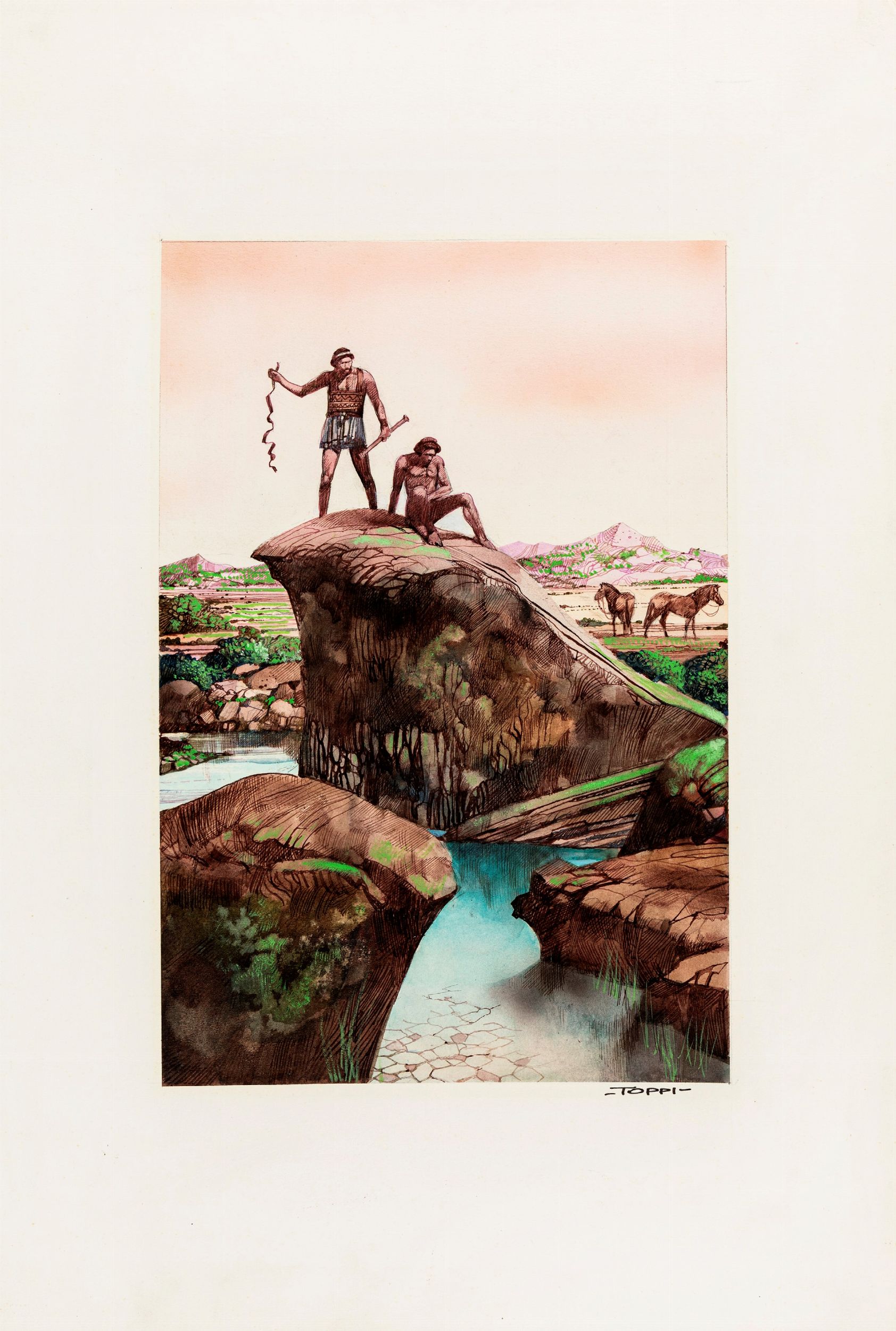 acquerello su cartone, 34,5 x 51 cm 1989 Illustrazione originale realizzata da Toppi per il romanzo fantasy storico La valle dei cavalli di Jean M. Auel, edito nella Selezione del Reader's Digest nel 1989. Lieve piega all'angolo superiore destro. Firmata.