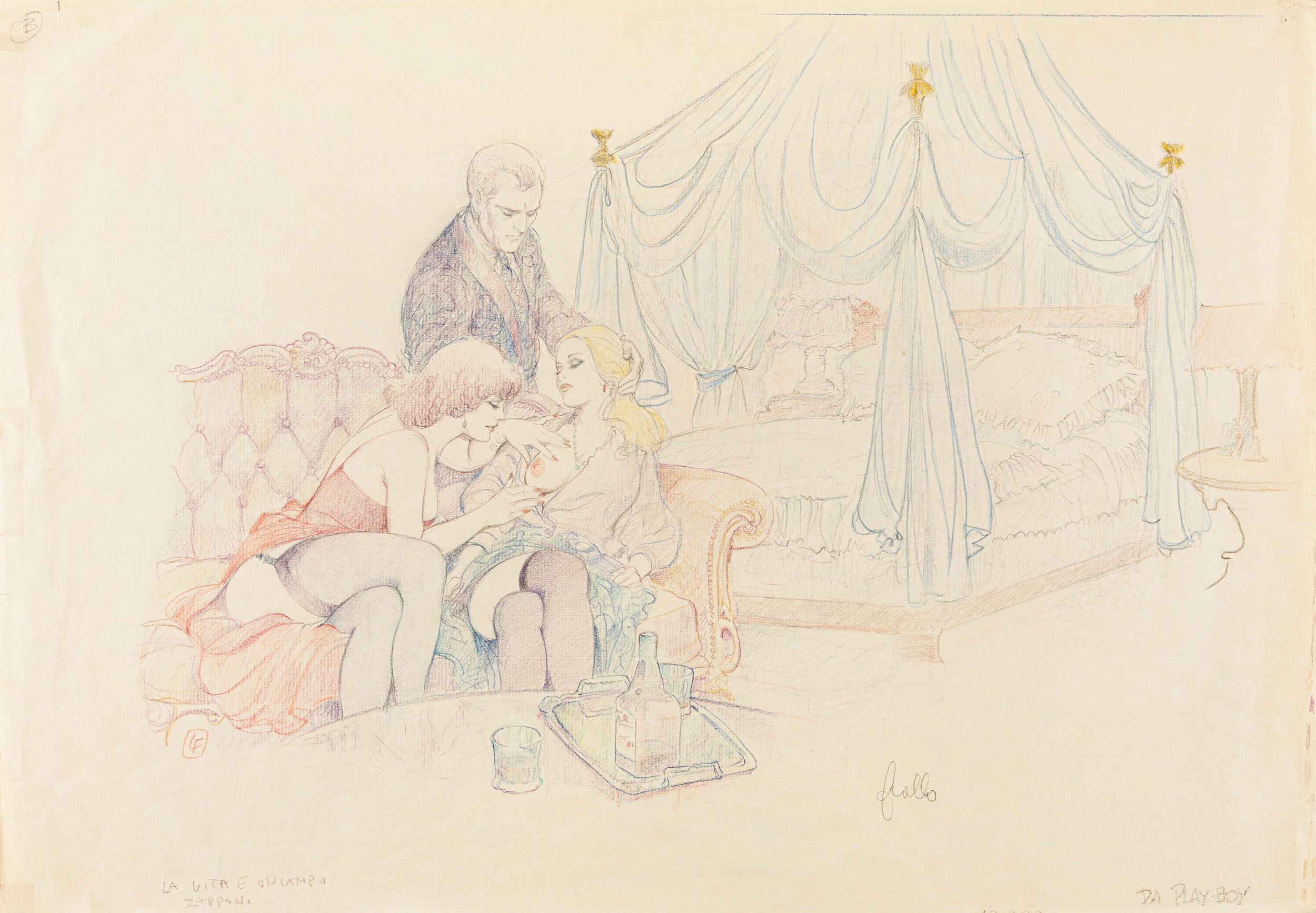 matita e pastelli su cartoncino, 47 x 34,5 cm 1990 Illustrazione originale realizzata da Frollo per il volume Gisella - La vita é un lampo: ricordi di case di tolleranza di Bernardino Zapponi, edito da Glénat Italia nel 1990. Opera pubblicata durante gli anni '90 su Playboy Italia, recentemente pubblicata a doppia pagina sul volume Mona street & C. dalle edizioni Lo Scarabeo nel 2016. Firmata.