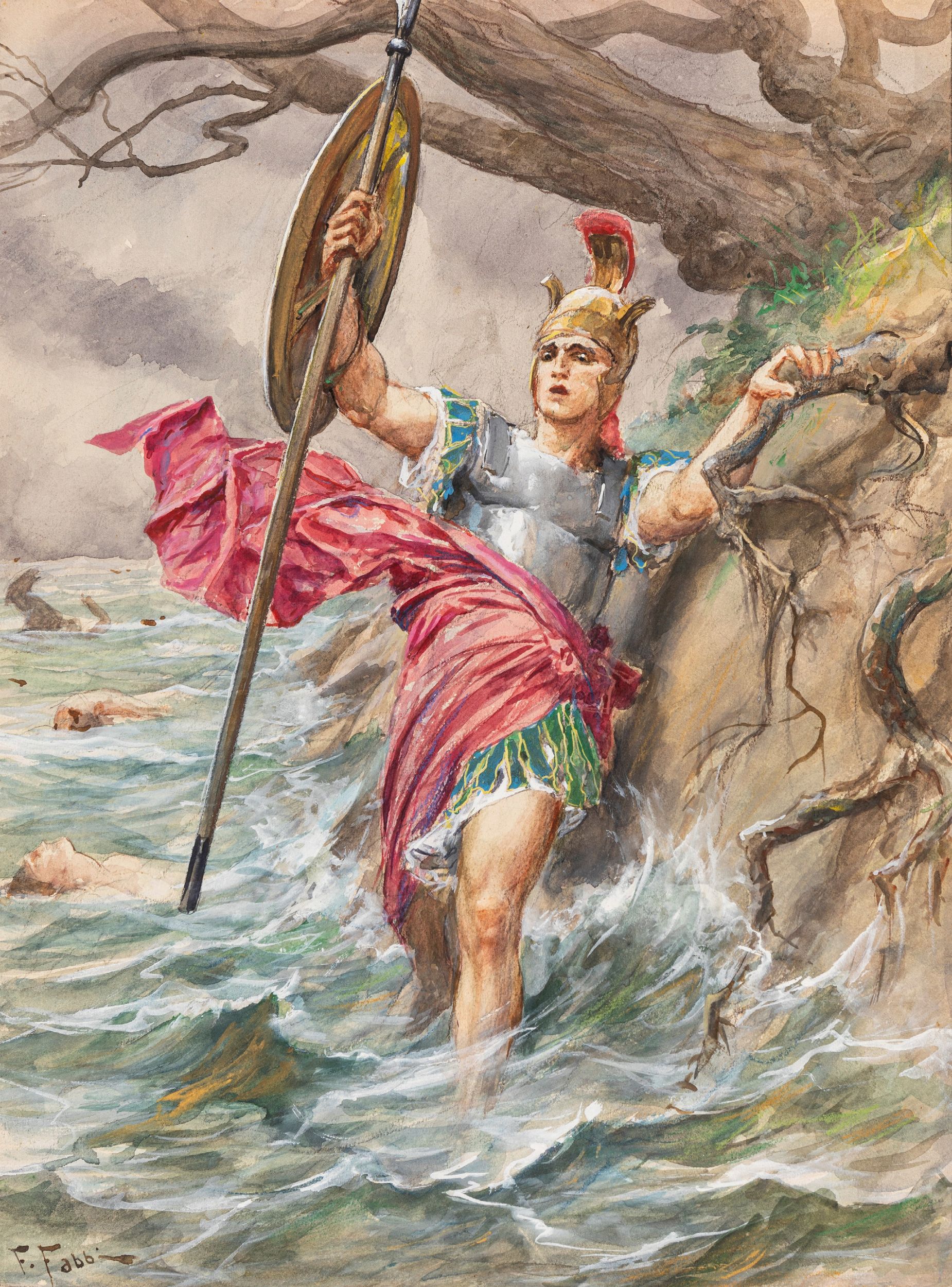 matita, china, acquerello e tempera su cartoncino, 30 x 40 cm 1930 Illustrazione originale realizzata da Fabbi per L’Iliade, pubblicata a pagina intera da Nerbini nel 1930. Pittore di fama internazionale Fabbi è considerato uno dei massimi esponenti della corrente orientalista. Firmata.
