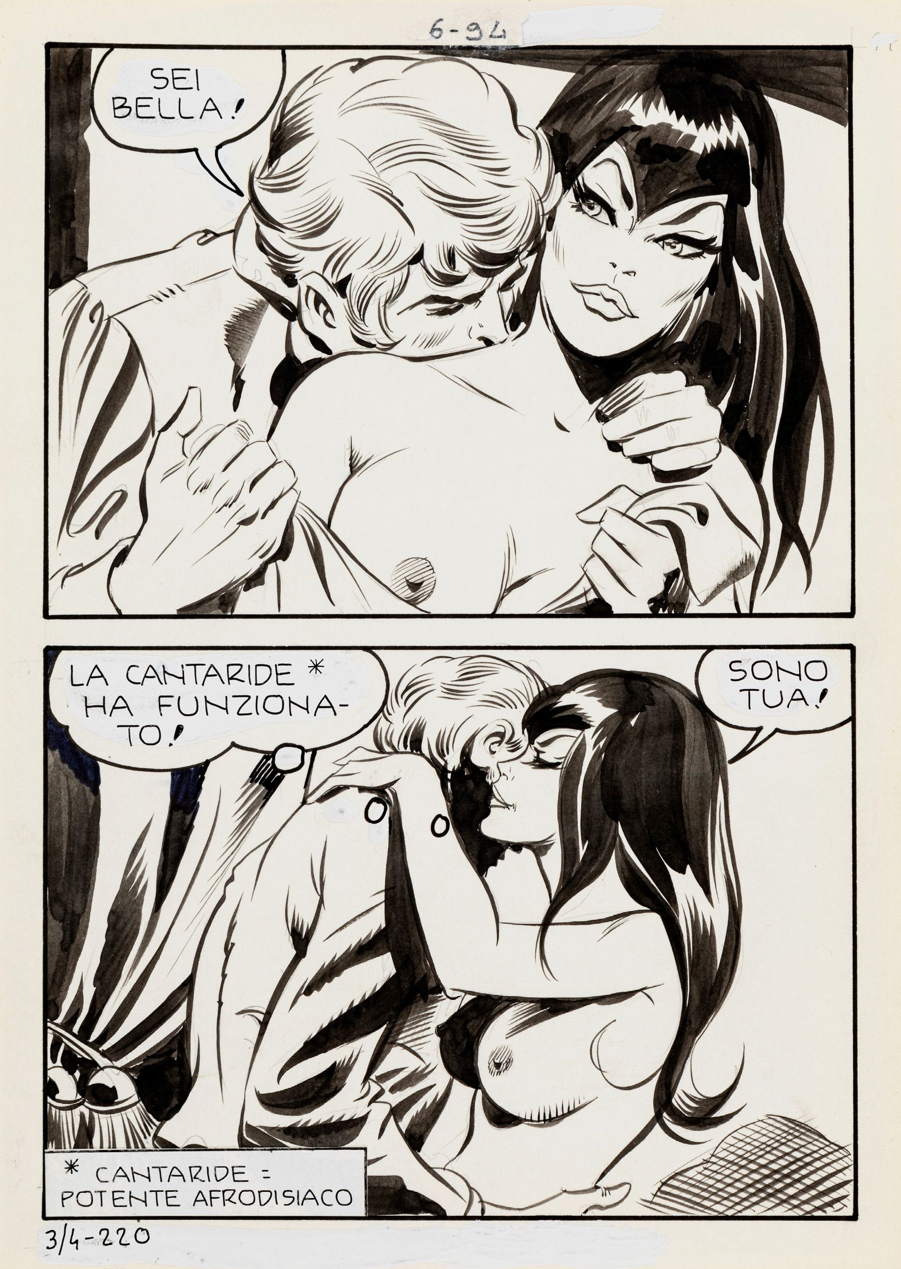 matita e china su cartoncino, 15 x 21 cm 1972 Tavola originale realizzata da Frollo per Sabba, edita su Lucifera n. 6 a pag. 94 dalla Edifumetto nel 1972. << Le cupe ombre del medioevo avvolgono la terra…gli uomini lottano per la luce, perché il bene non sia sopraffatto dal male >>, con queste parole ha inizio nell'Ottobre 1971 Lucifera, serie cult del genere horror-erotico creata da Giorgio Cavedon e Leone Frollo, che disegnerà magistralmente i primi 15 numeri della serie, per poi dedicarsi a tempo pieno a Biancaneve.