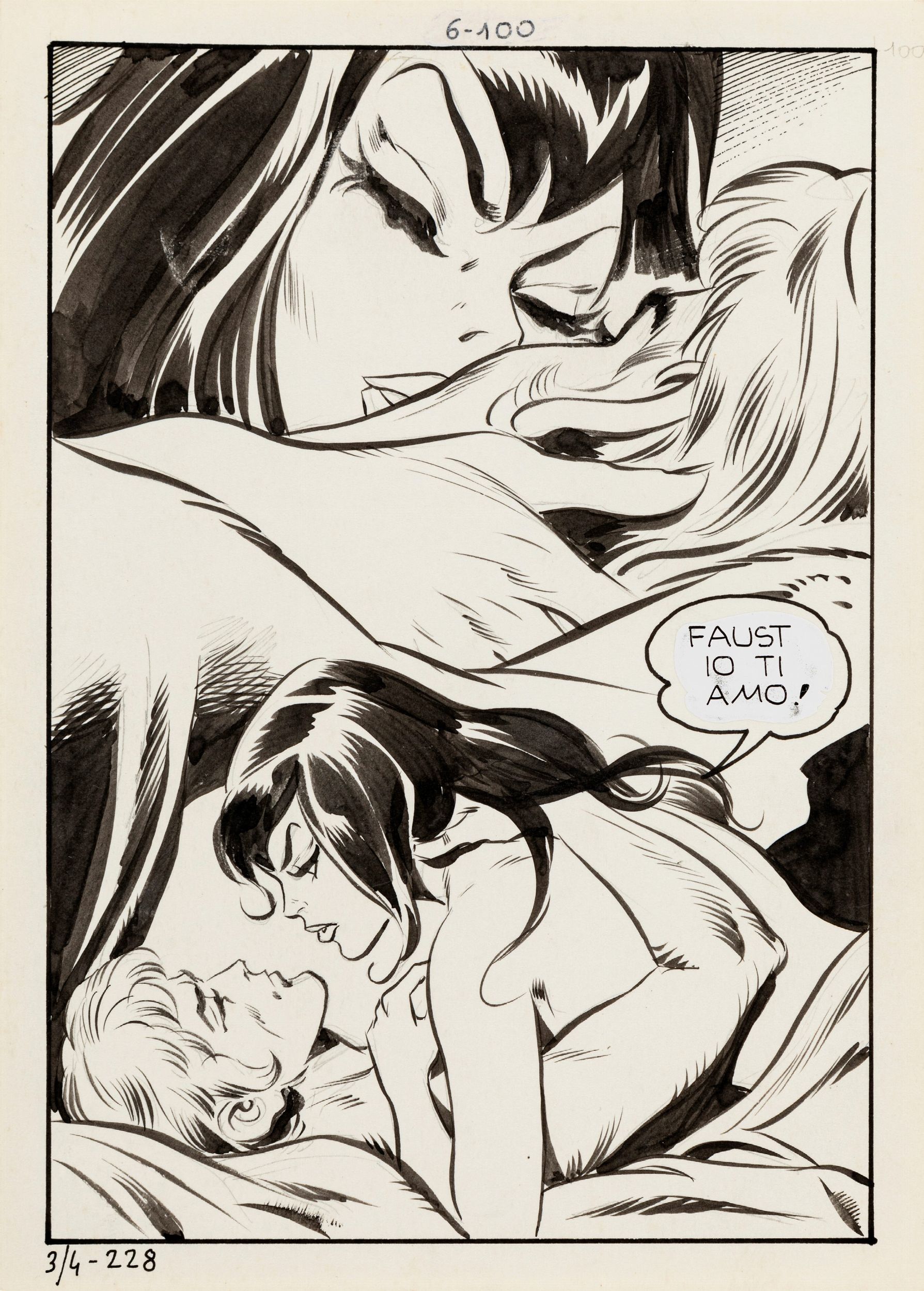 matita e china su cartoncino, 15 x 21 cm 1972 Tavola originale realizzata da Frollo per Sabba, edita su Lucifera n. 6 a pag. 100 dalla Edifumetto nel 1972. << Le cupe ombre del medioevo avvolgono la terra…gli uomini lottano per la luce, perché il bene non sia sopraffatto dal male >>, con queste parole ha inizio nell'Ottobre 1971 Lucifera, serie cult del genere horror-erotico creata da Giorgio Cavedon e Leone Frollo, che disegnerà magistralmente i primi 15 numeri della serie, per poi dedicarsi a tempo pieno a Biancaneve.