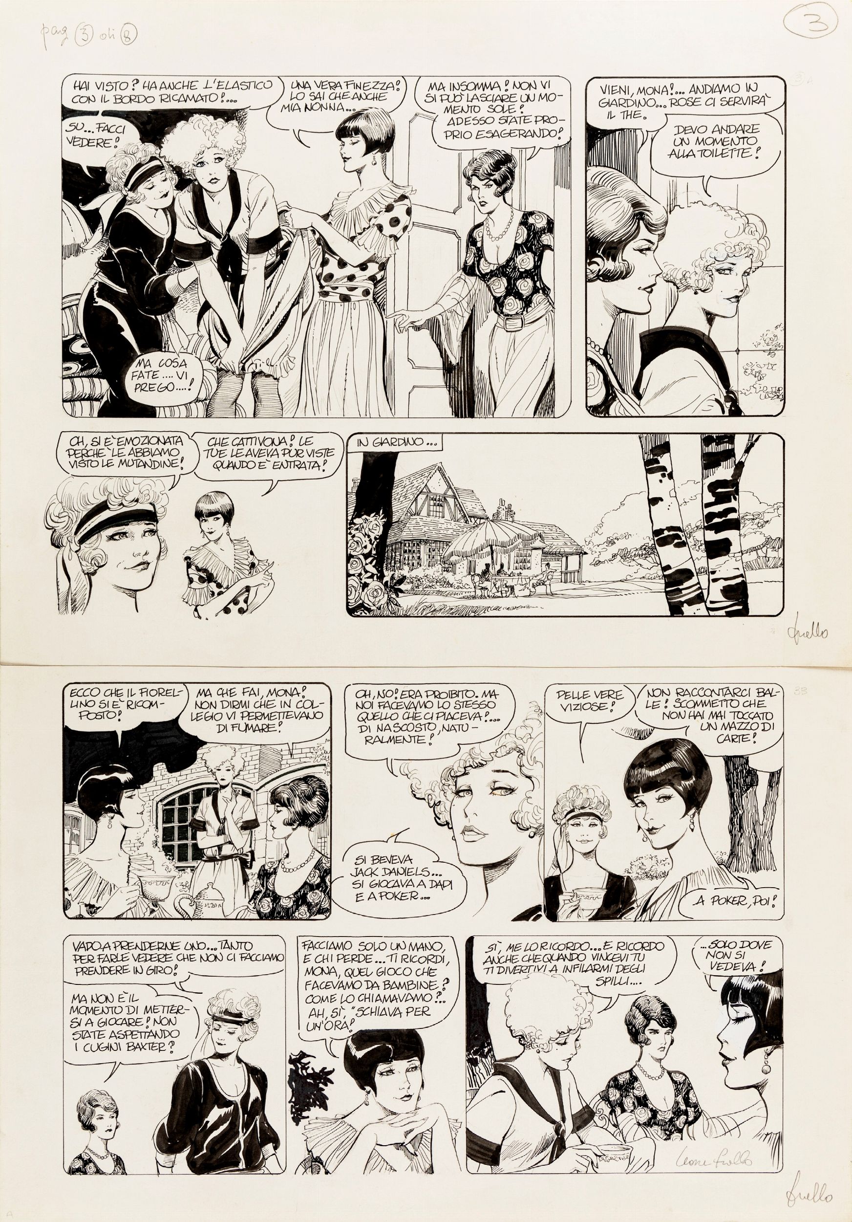1988 Tavola originale realizzata da Frollo per Entra in scena Mona Street, prima avventura erotica della sua Mona edita a pag. 3 nel volume Mona Street 1: The Secret Books of Glamour dalla Glamour International nel 1988. Pubblicata in Francia nello stesso anno con il titolo L'entrée en scène de Mona Street, segna la consacrazione di Frollo nell'Olimpo del fumetto erotico d'autore a livello mondiale. Siamo nella Boston degli anni Venti del Novecento, Mona Street è una scaltra fanciulla da poco uscita dal college, curve morbide candidamente ostentate, un viso innocente dallo sguardo ironico e un sorriso appena accennato sulle labbra. Mona Street è un normale nome inglese, ma se si pensa che Leone Frollo è veneziano allora il giocoso equivoco verbale diventa intuitivo. L'ammiccamento malizioso c'è già nel nome, dunque, ma tutte le storie di Mona Street sono sottese di ammorbante erotismo, ingegnosamente narrate dall'autore che, con un tratto morbido e voluttuoso a matita o china, ha tracciato un personaggio ben diverso dalle altre eroine del fumetto quasi sempre succubi dell'uomo: Mona ha una personalità da falsa ingenua che si prende gioco di tutti, diventando a volte vindice del proprio sesso. Su due pannelli. Firmata.