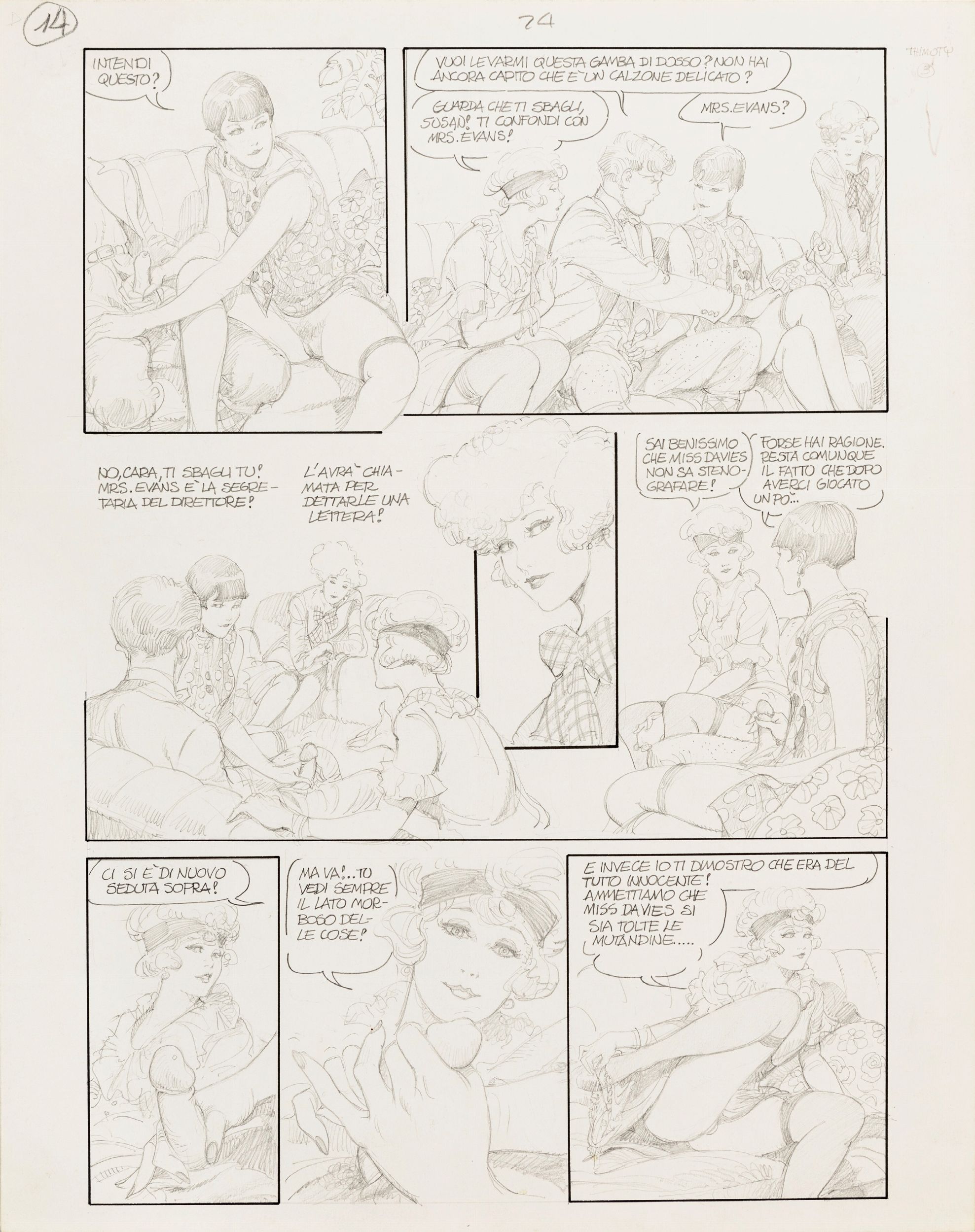 1988 Storia completa composta da 6 tavole originali realizzate da Frollo per Il vestito nuovo di Thimoty, avventura erotica della sua Mona edita nel volume Mona Street 1: The Secret Books of Glamour dalla Glamour International nel 1988. Pubblicata in Francia nello stesso anno con il titolo Le nouveau costume de Thimoty, segna la consacrazione di Frollo nell'Olimpo del fumetto erotico d'autore a livello mondiale. Siamo nella Boston degli anni Venti del Novecento, Mona Street è una scaltra fanciulla da poco uscita dal college, curve morbide candidamente ostentate, un viso innocente dallo sguardo ironico e un sorriso appena accennato sulle labbra. Mona Street è un normale nome inglese, ma se si pensa che Leone Frollo è veneziano allora il giocoso equivoco verbale diventa intuitivo. L'ammiccamento malizioso c'è già nel nome, dunque, ma tutte le storie di Mona Street sono sottese di ammorbante erotismo, ingegnosamente narrate dall'autore che, con un tratto morbido e voluttuoso a matita o china, ha tracciato un personaggio ben diverso dalle altre eroine del fumetto quasi sempre succubi dell'uomo: Mona ha una personalità da falsa ingenua che si prende gioco di tutti, diventando a volte vindice del proprio sesso. Lieve piega all'angolo superiore destro della prima pagina.
