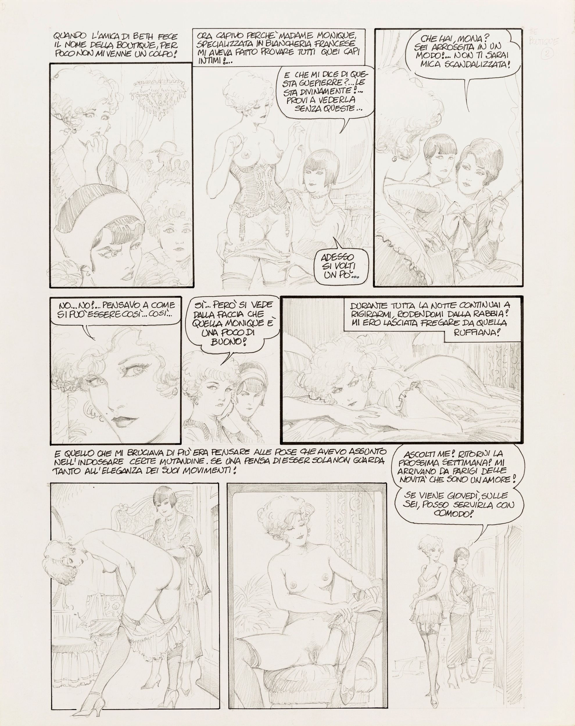 1991 Tavola originale realizzata da Frollo per La boutique de Monique, avventura erotica della sua Mona edita a pag. 2 nel volume Mona Street 2: The Secret Books of Glamour dalla Glamour International nel 1991. Pubblicata in Francia nello stesso anno con il titolo La boutique de Monique, segna la consacrazione di Frollo nell'Olimpo del fumetto erotico d'autore a livello mondiale. Siamo nella Boston degli anni Venti del Novecento, Mona Street è una scaltra fanciulla da poco uscita dal college, curve morbide candidamente ostentate, un viso innocente dallo sguardo ironico e un sorriso appena accennato sulle labbra. Mona Street è un normale nome inglese, ma se si pensa che Leone Frollo è veneziano allora il giocoso equivoco verbale diventa intuitivo. L'ammiccamento malizioso c'è già nel nome, dunque, ma tutte le storie di Mona Street sono sottese di ammorbante erotismo, ingegnosamente narrate dall'autore che, con un tratto morbido e voluttuoso a matita o china, ha tracciato un personaggio ben diverso dalle altre eroine del fumetto quasi sempre succubi dell'uomo: Mona ha una personalità da falsa ingenua che si prende gioco di tutti, diventando a volte vindice del proprio sesso. Firmata al retro.