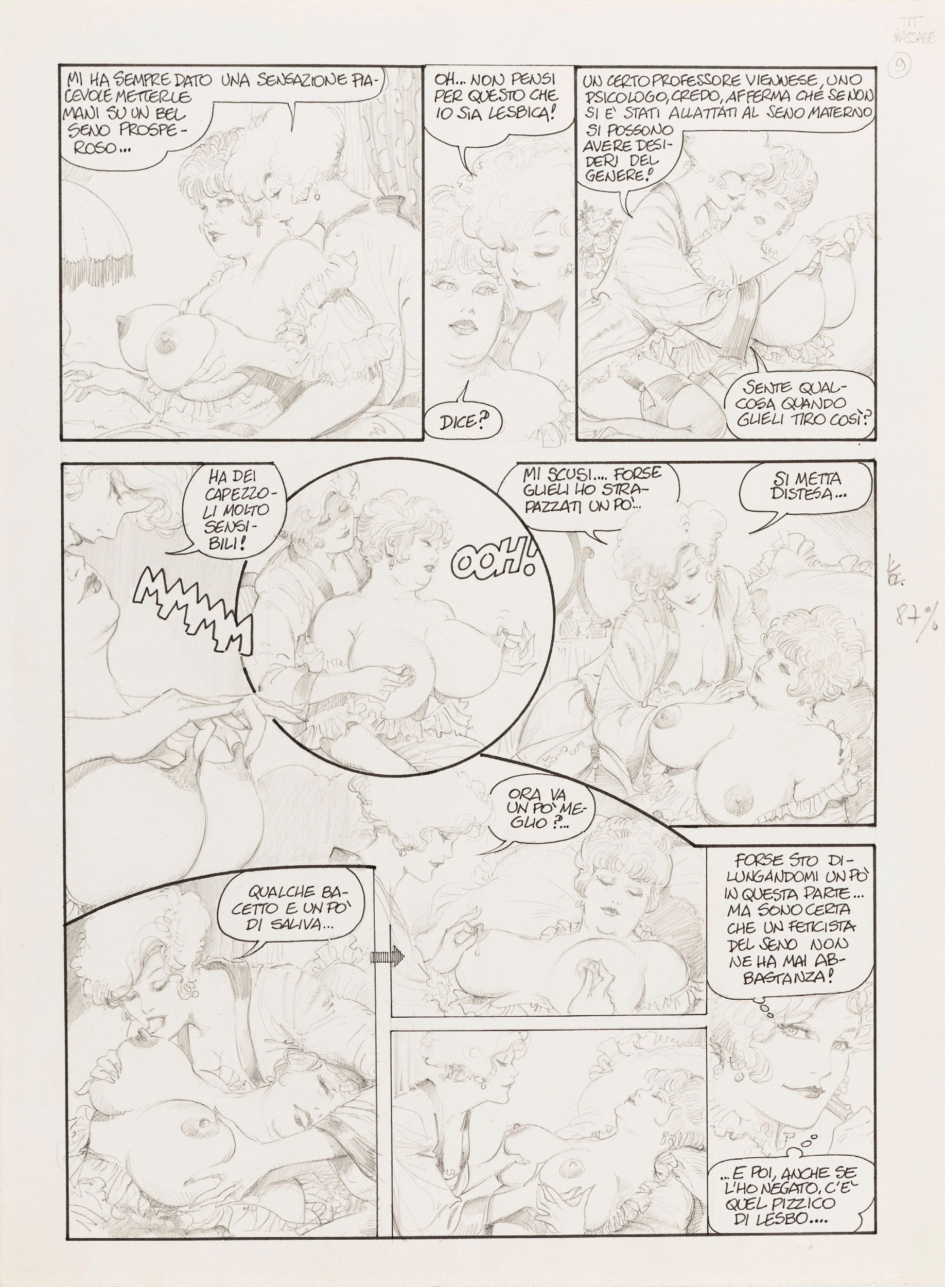 1991 Tavola originale realizzata da Frollo per Tith massage, avventura erotica della sua Mona edita a pag. 9 nel volume Mona Street 2: The Secret Books of Glamour dalla Glamour International nel 1991. Pubblicata in Francia nello stesso anno con il titolo Tits massages, segna la consacrazione di Frollo nell'Olimpo del fumetto erotico d'autore a livello mondiale. Siamo nella Boston degli anni Venti del Novecento, Mona Street è una scaltra fanciulla da poco uscita dal college, curve morbide candidamente ostentate, un viso innocente dallo sguardo ironico e un sorriso appena accennato sulle labbra. Mona Street è un normale nome inglese, ma se si pensa che Leone Frollo è veneziano allora il giocoso equivoco verbale diventa intuitivo. L'ammiccamento malizioso c'è già nel nome, dunque, ma tutte le storie di Mona Street sono sottese di ammorbante erotismo, ingegnosamente narrate dall'autore che, con un tratto morbido e voluttuoso a matita o china, ha tracciato un personaggio ben diverso dalle altre eroine del fumetto quasi sempre succubi dell'uomo: Mona ha una personalità da falsa ingenua che si prende gioco di tutti, diventando a volte vindice del proprio sesso.