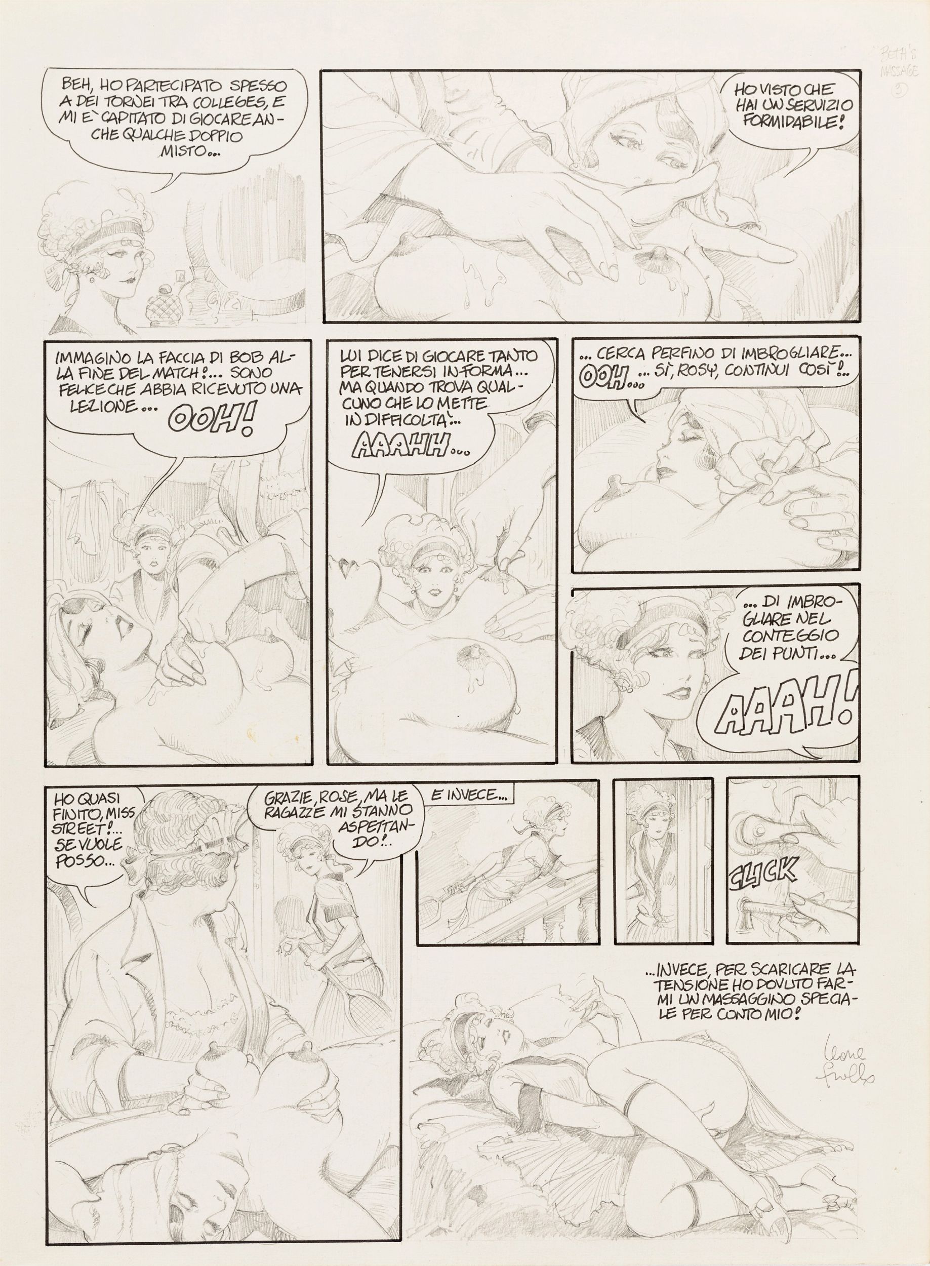1991 Tavola originale realizzata da Frollo per Tith massage, avventura erotica della sua Mona edita a pag. 3 nel volume Mona Street 2: The Secret Books of Glamour dalla Glamour International nel 1991. Pubblicata in Francia nello stesso anno con il titolo Tits massages, segna la consacrazione di Frollo nell'Olimpo del fumetto erotico d'autore a livello mondiale. Siamo nella Boston degli anni Venti del Novecento, Mona Street è una scaltra fanciulla da poco uscita dal college, curve morbide candidamente ostentate, un viso innocente dallo sguardo ironico e un sorriso appena accennato sulle labbra. Mona Street è un normale nome inglese, ma se si pensa che Leone Frollo è veneziano allora il giocoso equivoco verbale diventa intuitivo. L'ammiccamento malizioso c'è già nel nome, dunque, ma tutte le storie di Mona Street sono sottese di ammorbante erotismo, ingegnosamente narrate dall'autore che, con un tratto morbido e voluttuoso a matita o china, ha tracciato un personaggio ben diverso dalle altre eroine del fumetto quasi sempre succubi dell'uomo: Mona ha una personalità da falsa ingenua che si prende gioco di tutti, diventando a volte vindice del proprio sesso. Firmata.
