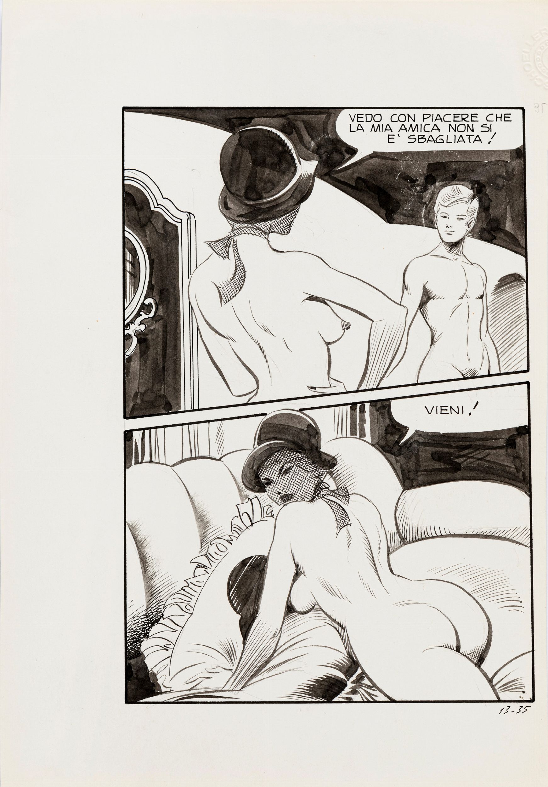 1976 Tavola originale realizzata da Frollo per Brigitte Corot, edita su Naga n. 13 a pag. 35 dalla Edifumetto nel 1976. La duchessa Natascia Romanoff, figlia dello zar Nicola II di Russia, sfuggita alla morte durante il massacro della sua famiglia a Ekaterinburg grazie a un trucco magico insegnatole da Rasputin, decide di cambiare il suo nome di battesimo in Naga e scoprire il mondo del dopoguerra. Vive con il suo servo e amante, Yul, con cui condivide le sue avventure.