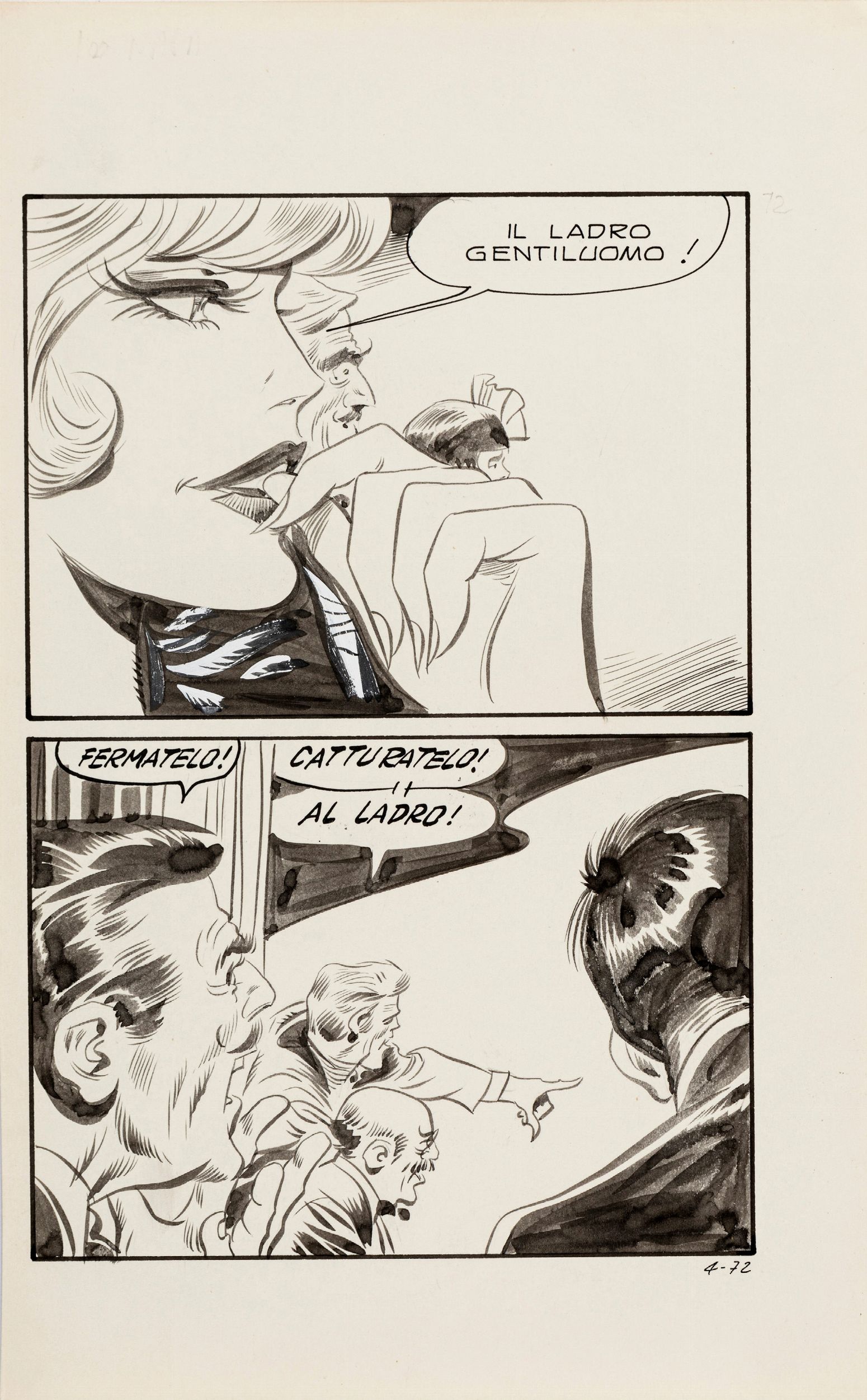 matita e china su cartoncino, 16 x 25,5 cm 1975 Tavola originale realizzata da Frollo per L'uomo-supposta, edita su Naga n. 4 a pag. 72 dalla Edifumetto nel 1975. La duchessa Natascia Romanoff, figlia dello zar Nicola II di Russia, sfuggita alla morte durante il massacro della sua famiglia a Ekaterinburg grazie a un trucco magico insegnatole da Rasputin, decide di cambiare il suo nome di battesimo in Naga e scoprire il mondo del dopoguerra. Vive con il suo servo e amante, Yul, con cui condivide le sue avventure.