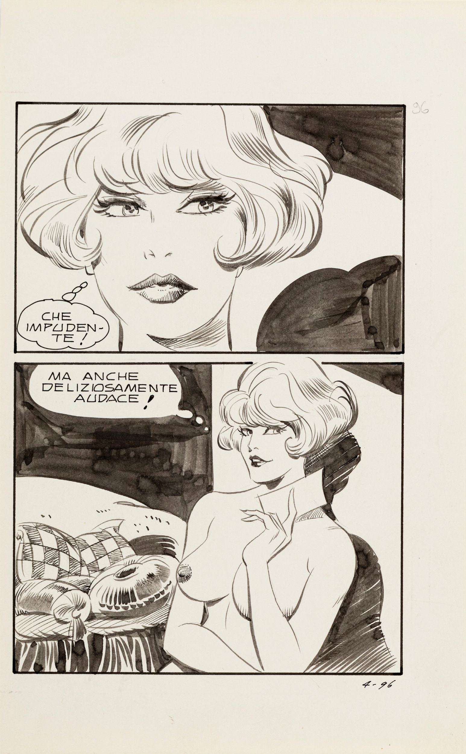 matita e china su cartoncino, 16 x 25,5 cm 1975 Tavola originale realizzata da Frollo per L'uomo-supposta, edita su Naga n. 4 a pag. 96 dalla Edifumetto nel 1975. La duchessa Natascia Romanoff, figlia dello zar Nicola II di Russia, sfuggita alla morte durante il massacro della sua famiglia a Ekaterinburg grazie a un trucco magico insegnatole da Rasputin, decide di cambiare il suo nome di battesimo in Naga e scoprire il mondo del dopoguerra. Vive con il suo servo e amante, Yul, con cui condivide le sue avventure.