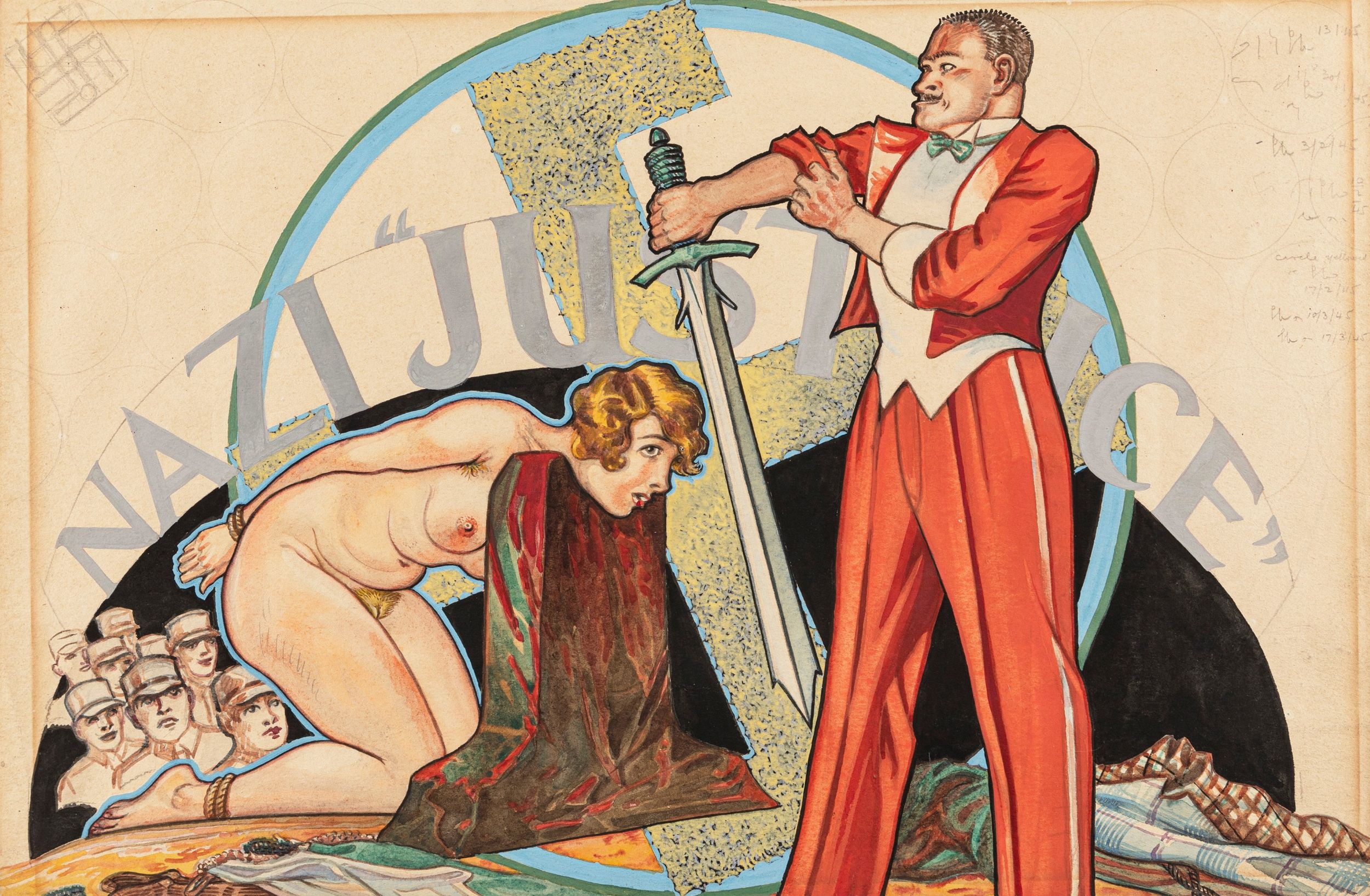 matita e tempera su cartoncino, 40,5 x 27 cm 1945 Illustrazione originale realizzata nel 1945 per una campagna di propaganda anti nazista. Le virgolette che sormontano la parola Justice stanno a sottintendere il carattere denigratorio di questa immagine, un boia sui generis che sta per giustiziare una donna (ariana) probabilmente rea di collaborazionismo con il nemico. Datata.