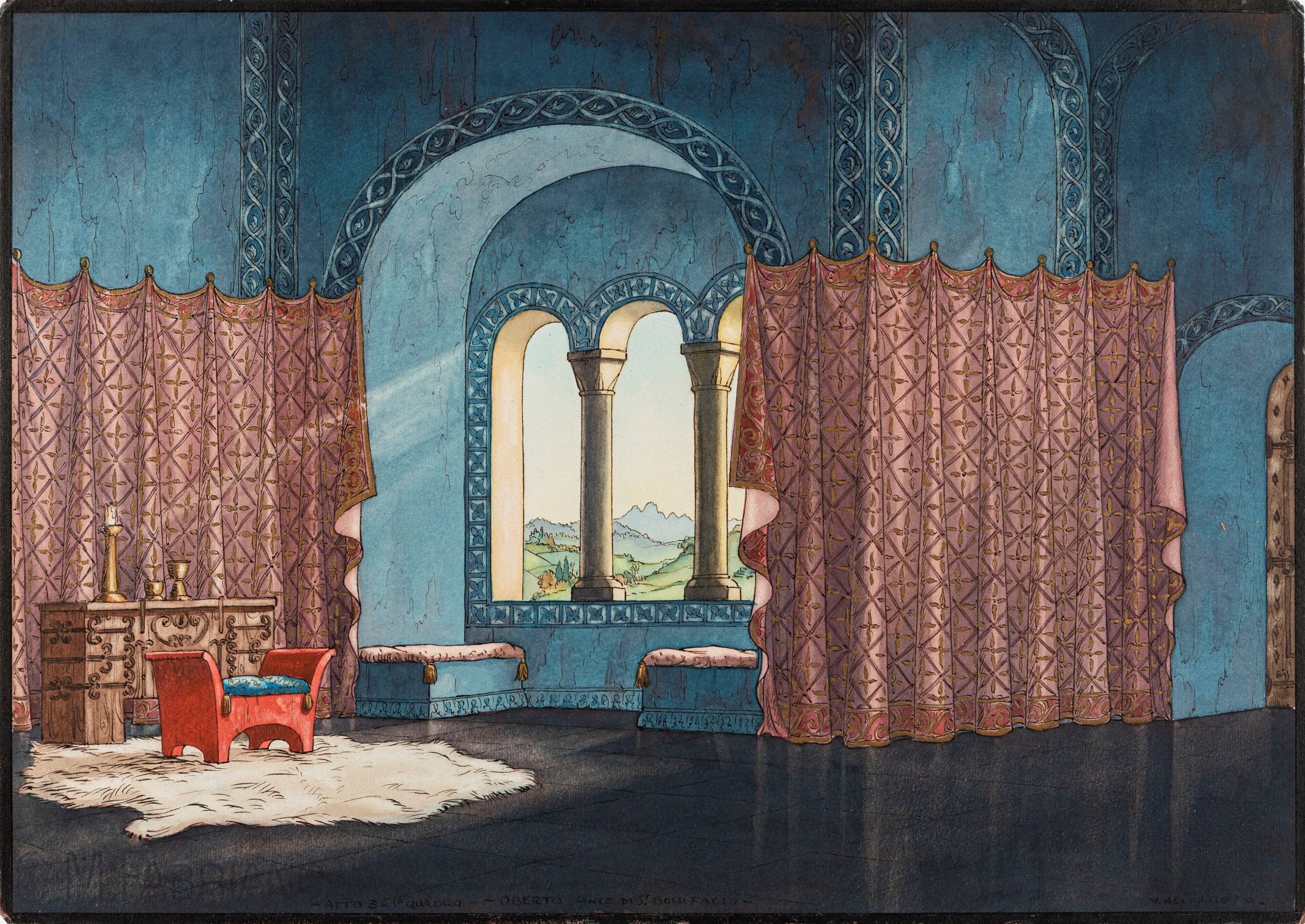 china e acquerello su cartone, 46,5 x 33 cm 1950 Illustrazione originale realizzata da Accornero per la scenografia teatrale dell‘opera Oberto Conte Di San Bonifacio di Giuseppe Verdi andata in scena al Teatro della Scala di Milano nel 1950/1951. Piccole ammaccature agli angoli. Firmata e titolata.