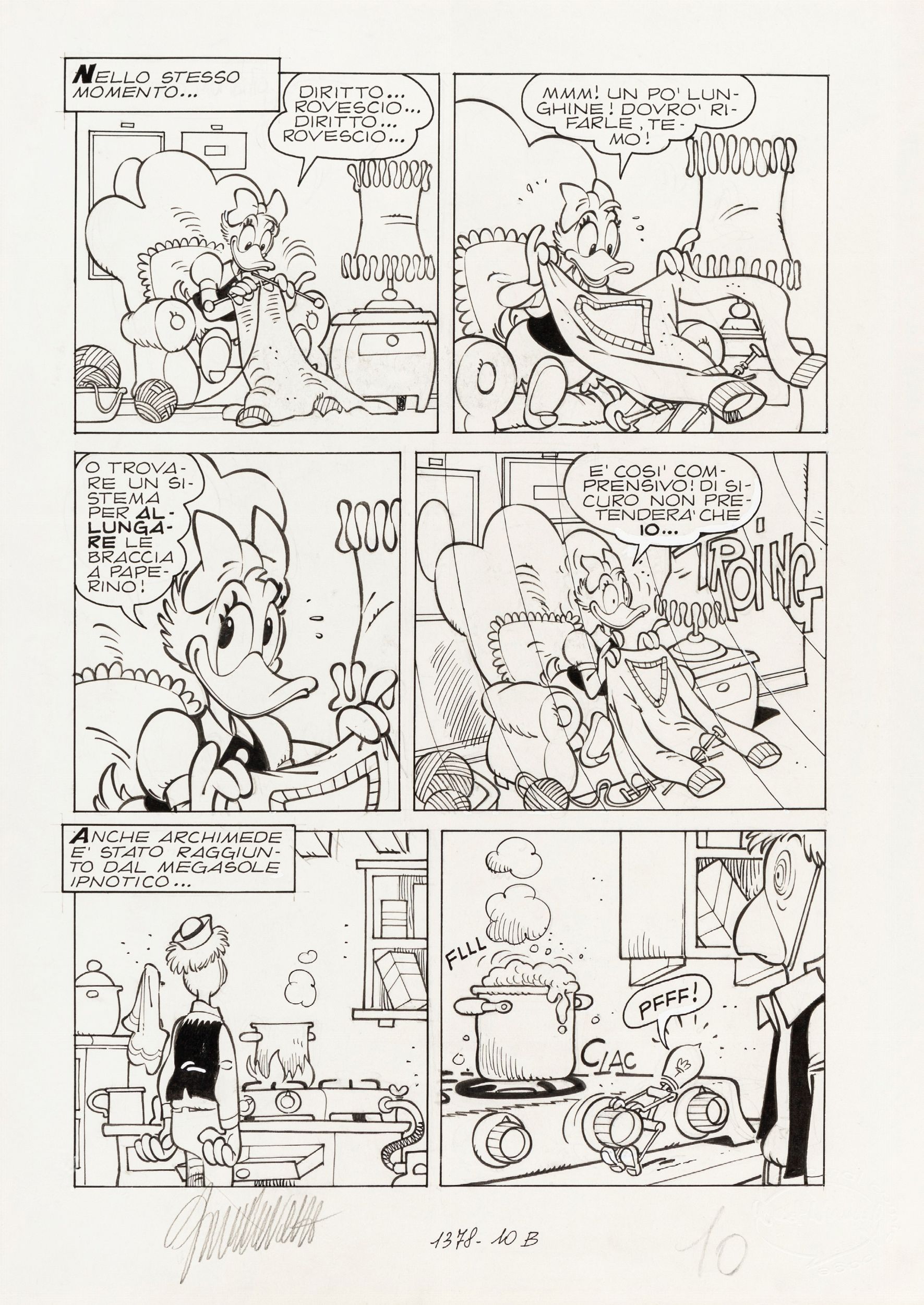 matita e china su cartoncino, 25 x 35 cm 1982 Tavola originale realizzata da Cavazzano per Paperino solo contro tutti edita su Topolino n. 1378 a pag. 10 nell'aprile 1982. Tavola contenuta nel suo folder originale (Walt Disney original comic art) con certificato d'autenticità datato 9 maggio 1998, blister con sigillo intatto. Firmata.