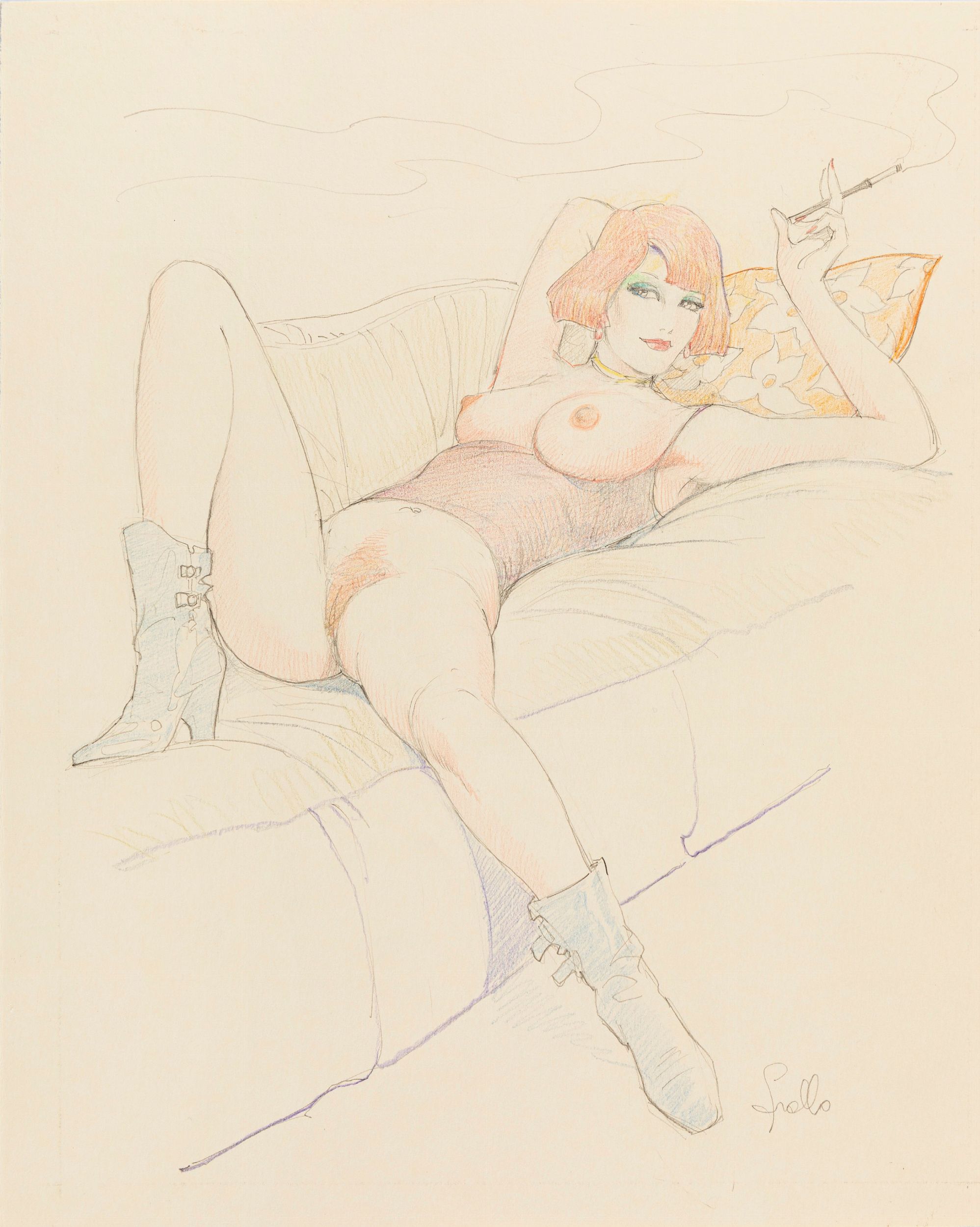 anni 90 Illustrazione originale realizzata da Frollo durante gli anni '90, una raffinata e seducente visione del maestro veneziano dell'eros. Firmata.