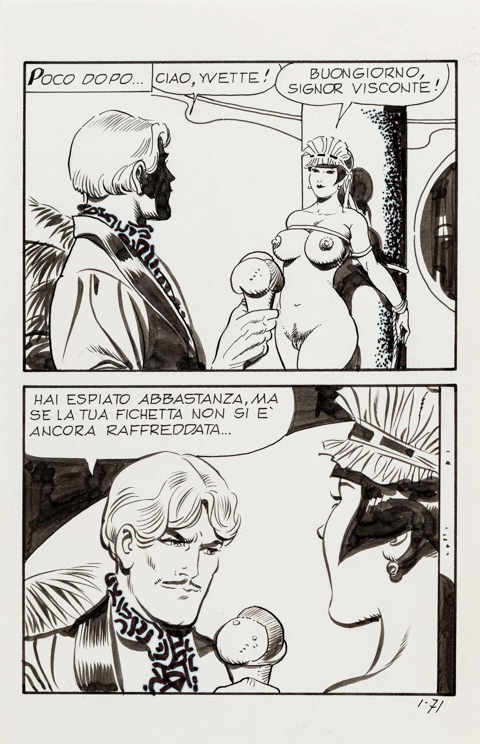 matita e china su cartoncino, 15 x 22,5 cm 1988 Tavola originale realizzata da Frollo per Villa Orgasmo, edita su Storie erotiche n. 1 a pag. 71 dalla Edifumetto nel 1985. << Alle porte di Roma, circondata da un incantevole giardino, sorge Villa Orgasmo, di proprietà del Visconte Aldobrando Ranuccio Caldobaldi, noto gaudente della capitale. Una vita interamente dedicata ai piaceri... >>.