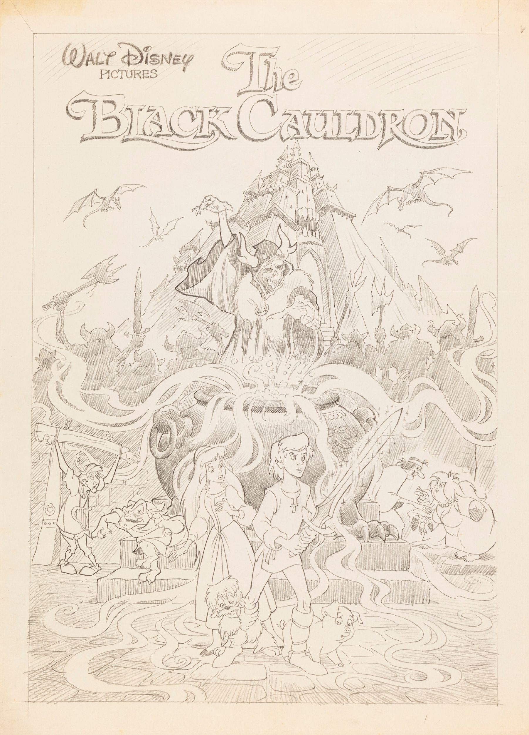 1985 Bozzetto preliminare realizzato da Napoli per la locandina ufficiale del film Taron e la pentola magica, 25° Classico Disney diretto da Ted Berman e da Richard Rich, prodotto dalla Walt Disney Productions nel 1985. Pellicola cult tra gli appassionati Disney e caposaldo dell´animazione fantasy, al momento dell´uscita fu il lungometraggio animato più costoso mai realizzato ed il primo a utilizzare per alcune scene la computer grafica (CGI). L´opera, fortemente controversa a causa delle tematiche e di molte scene horror, rivoluzionò il mondo dell´animazione e fu fonte d´ispirazione per molti registi, tra cui Tim Burton che vi lavorò come art director.