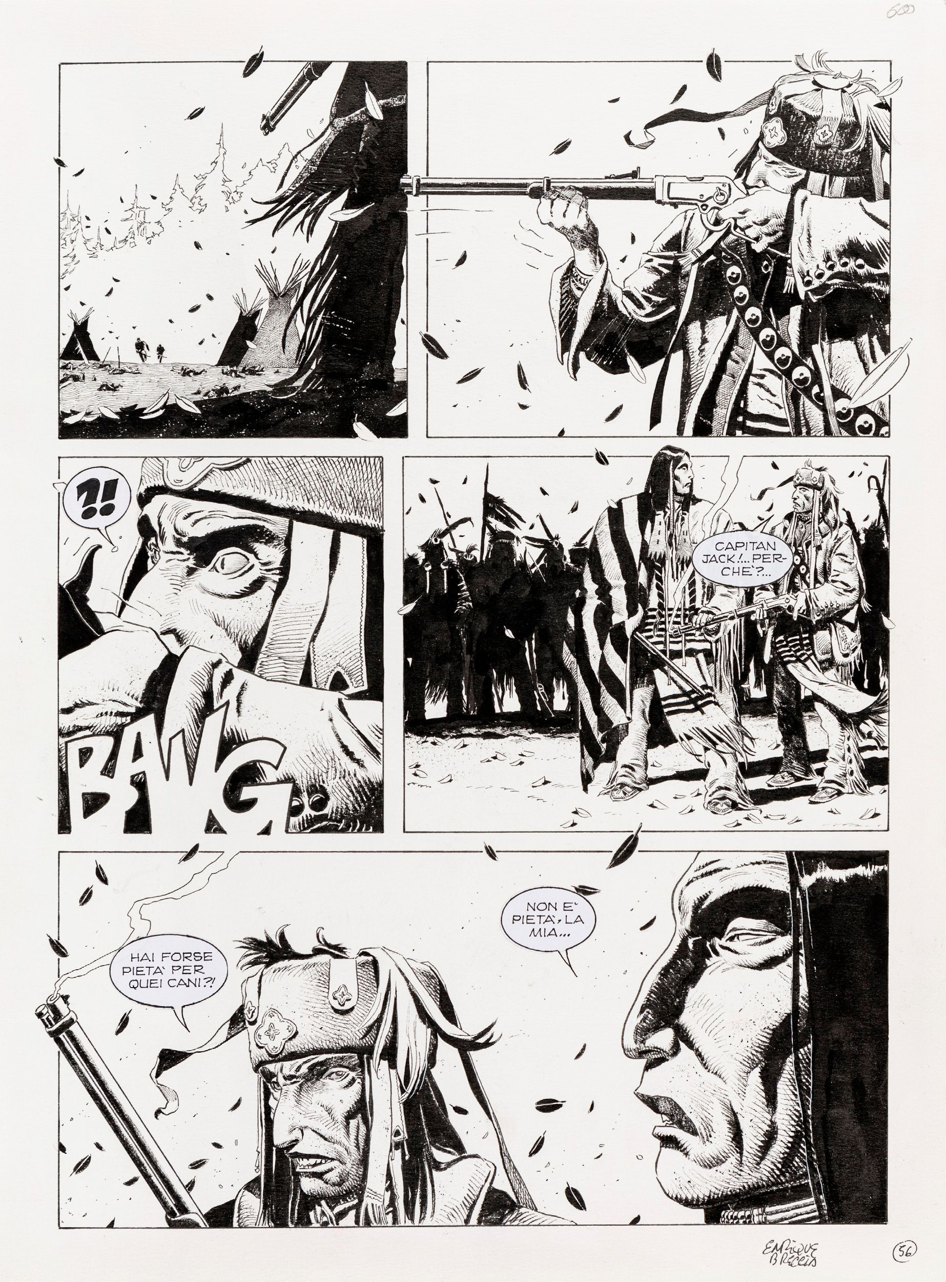 matita e china su cartoncino, 30,5 x 42 cm 2016 Tavola originale realizzata da Breccia per il suo Texone Capitan Jack edita a pag. 56 dalla Bonelli nel 2016. Pagina di grande impatto per una delle migliori opere dell’artista argentino, qui alle prese per la prima volta con l’eroe per eccellenza di casa Bonelli. Firmata.
