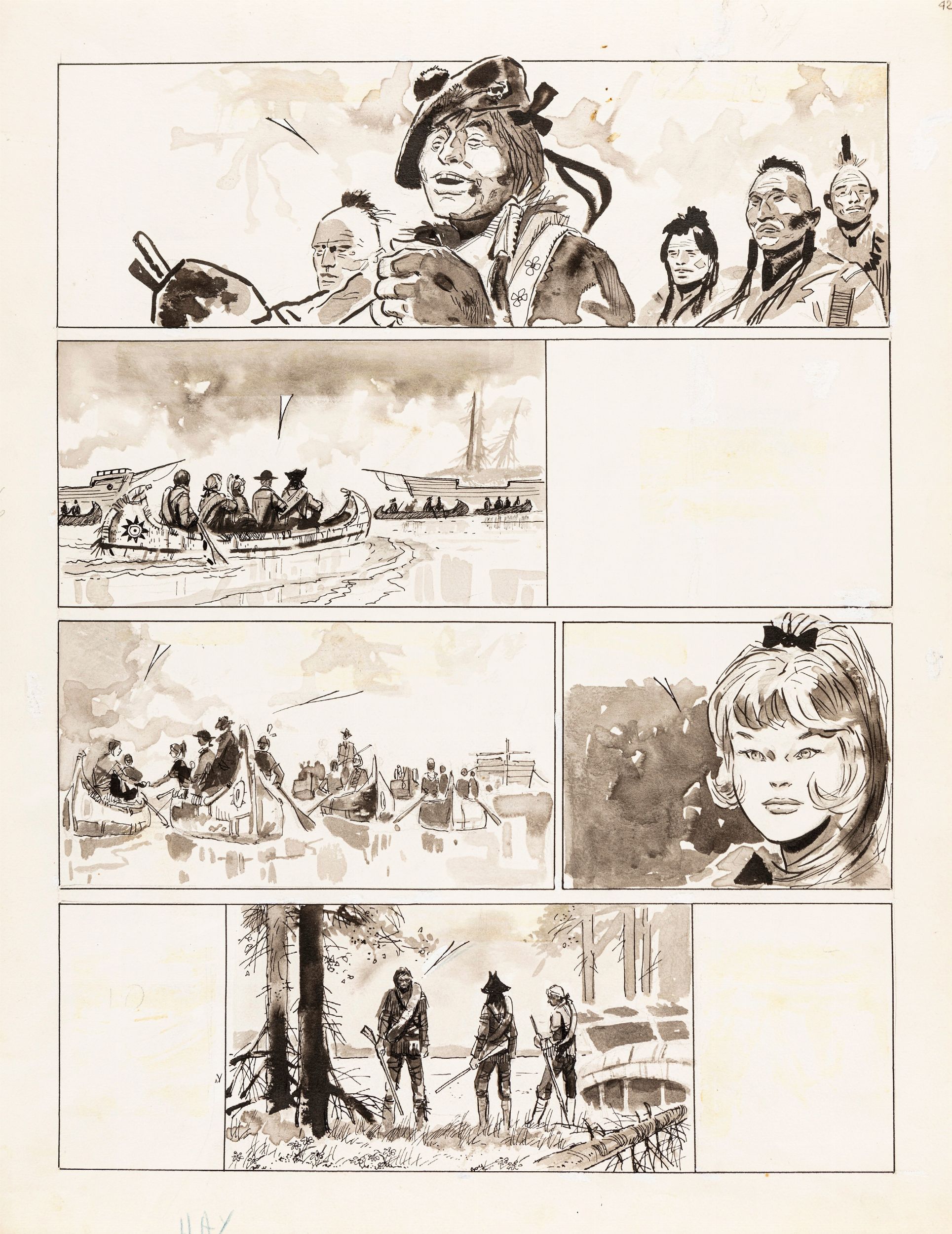 matita, china e acquerello su cartoncino, 37,5 x 48 cm 1959 Tavola originale realizzata da Pratt per il XIX episodio di Ticonderoga, pubblicata per la prima volta in Argentina sulla rivista Frontera Extra n. 6 a pag. 2 dall‘Editorial Frontera nell‘Aprile del 1959. Recentemente pubblicata su Ticonderoga Vol. 2 a pag. 56 dalla Rizzoli nel 2017.