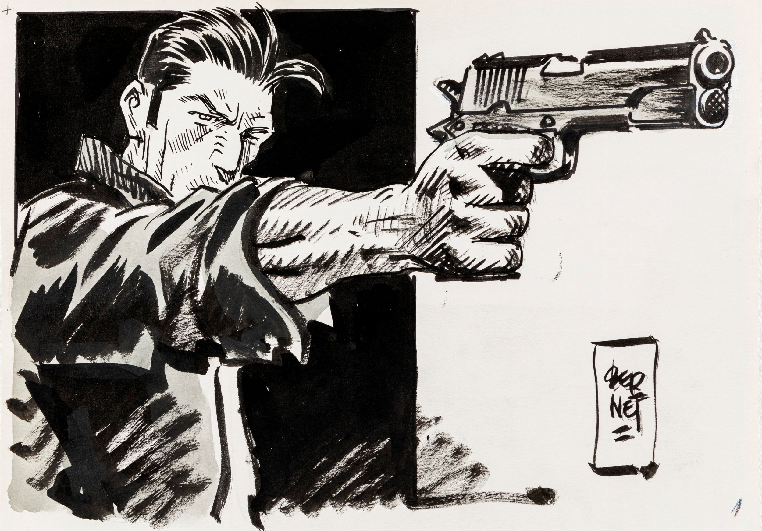 matita e china su cartoncino, 30 x 21 cm anni 2000 Illustrazione originale realizzata da Bernet per il suo Torpedo. Antieroe per antonomasia, Torpedo è protagonista di uno dei fumetti noir più amati e celebrati dal pubblico di tutto il mondo che rese l‘artista spagnolo il maestro indiscusso di questo genere. Firmata.