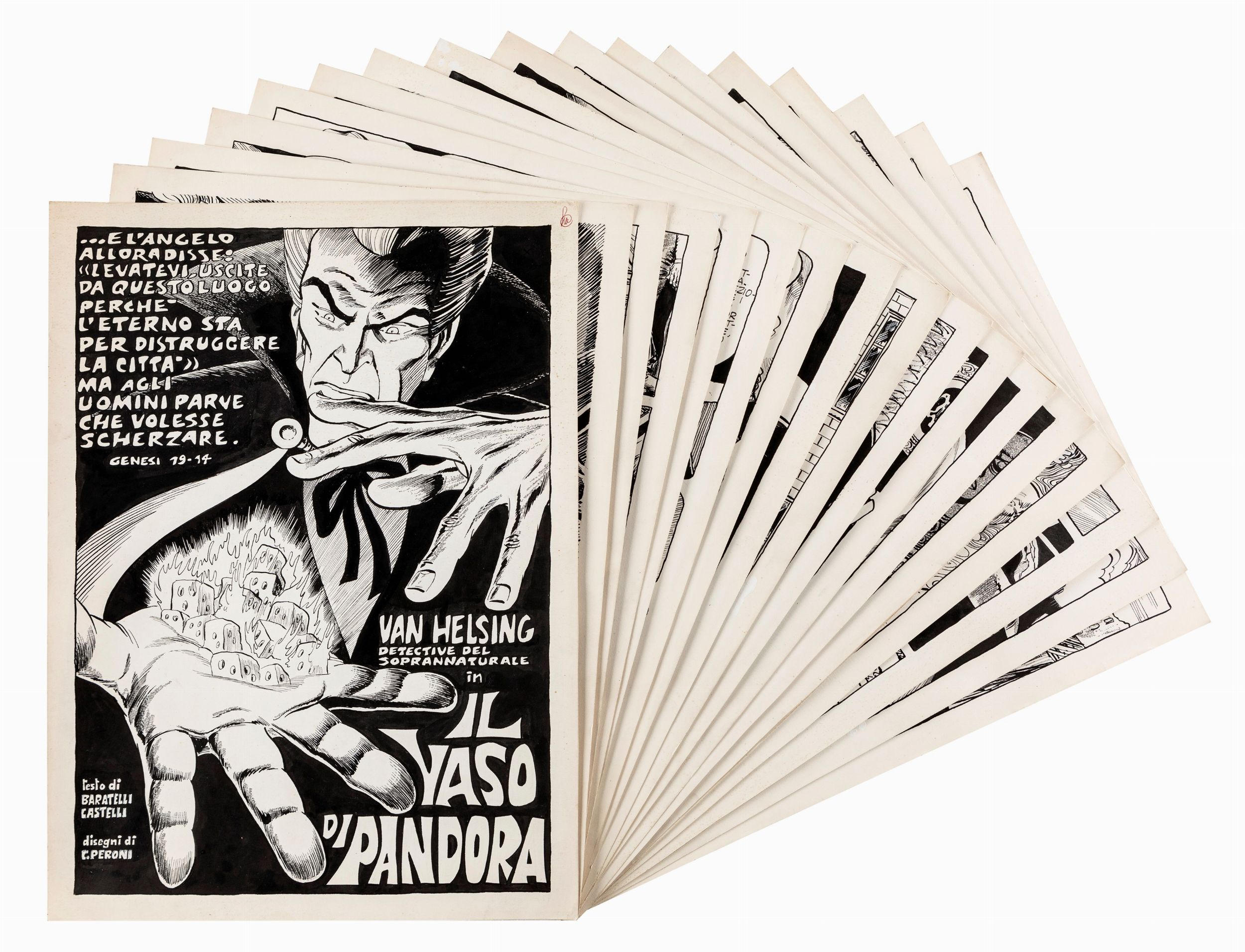 matita e china su cartoncino, 29,5 x 40 cm ciascuno 1970 Storia completa composta da 20 tavole originali realizzate da Peroni per Il vaso di Pandora quinta ed ultima avventura di Van Helsing edita per la prima volta sulle pagine della rivista Psyco n. 5 nel 1970. Testi di Alfredo Castelli.