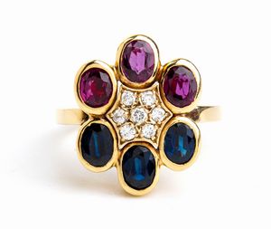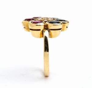 in oro giallo 18k, a forma di fiore, impreziosito da diamanti, rubini e zaffiri.