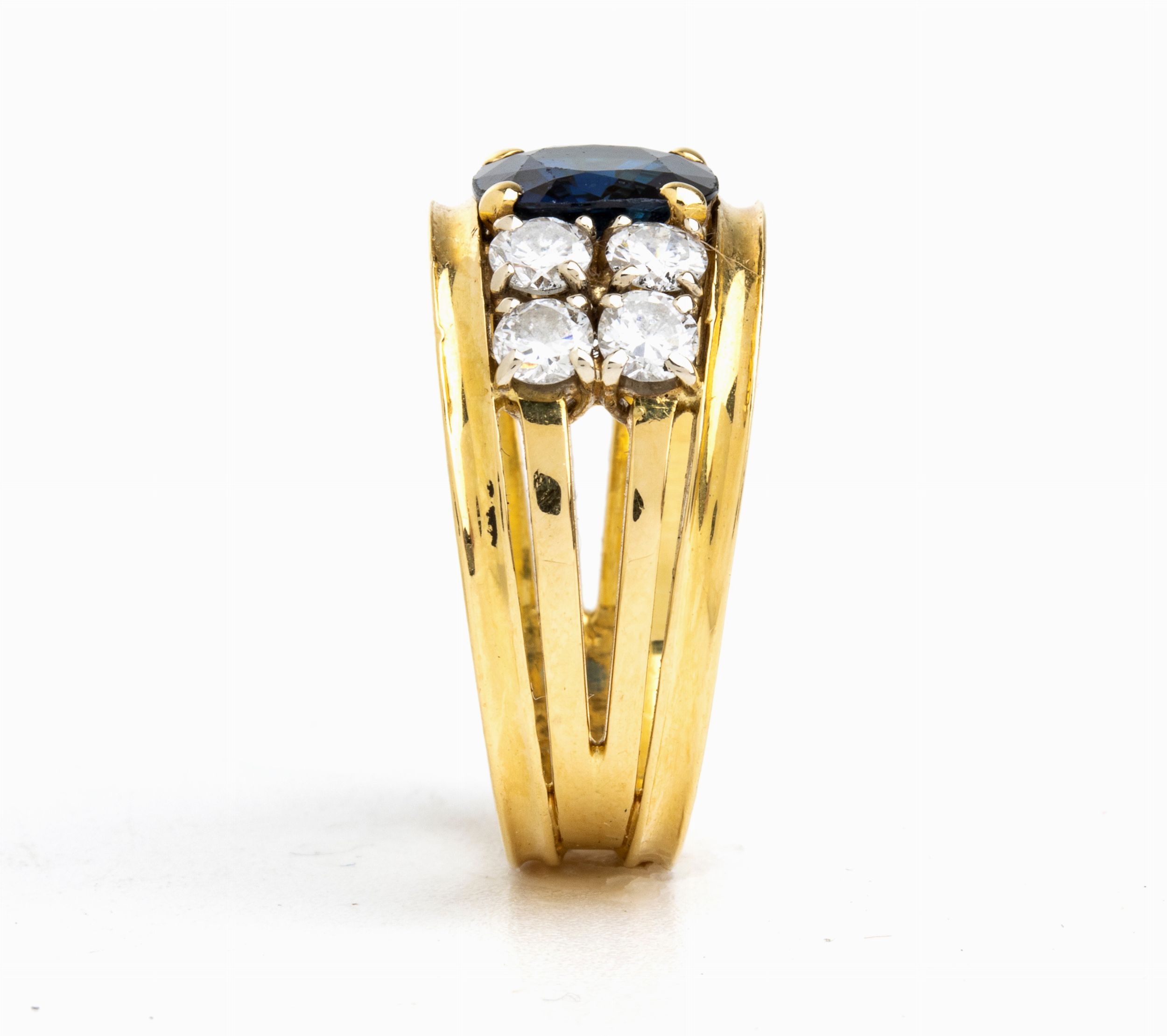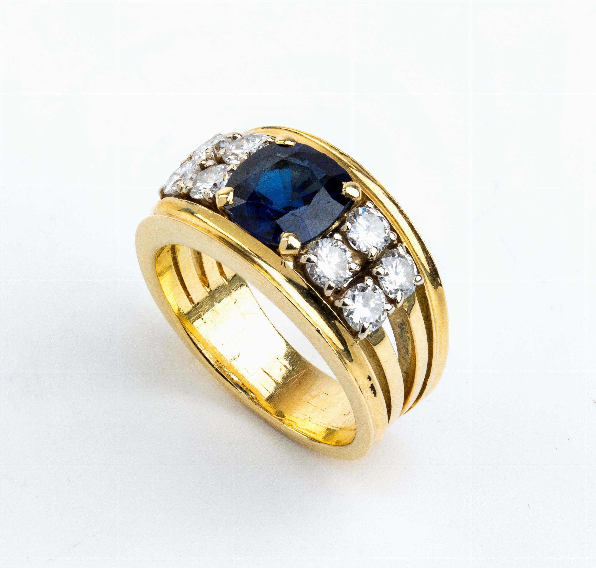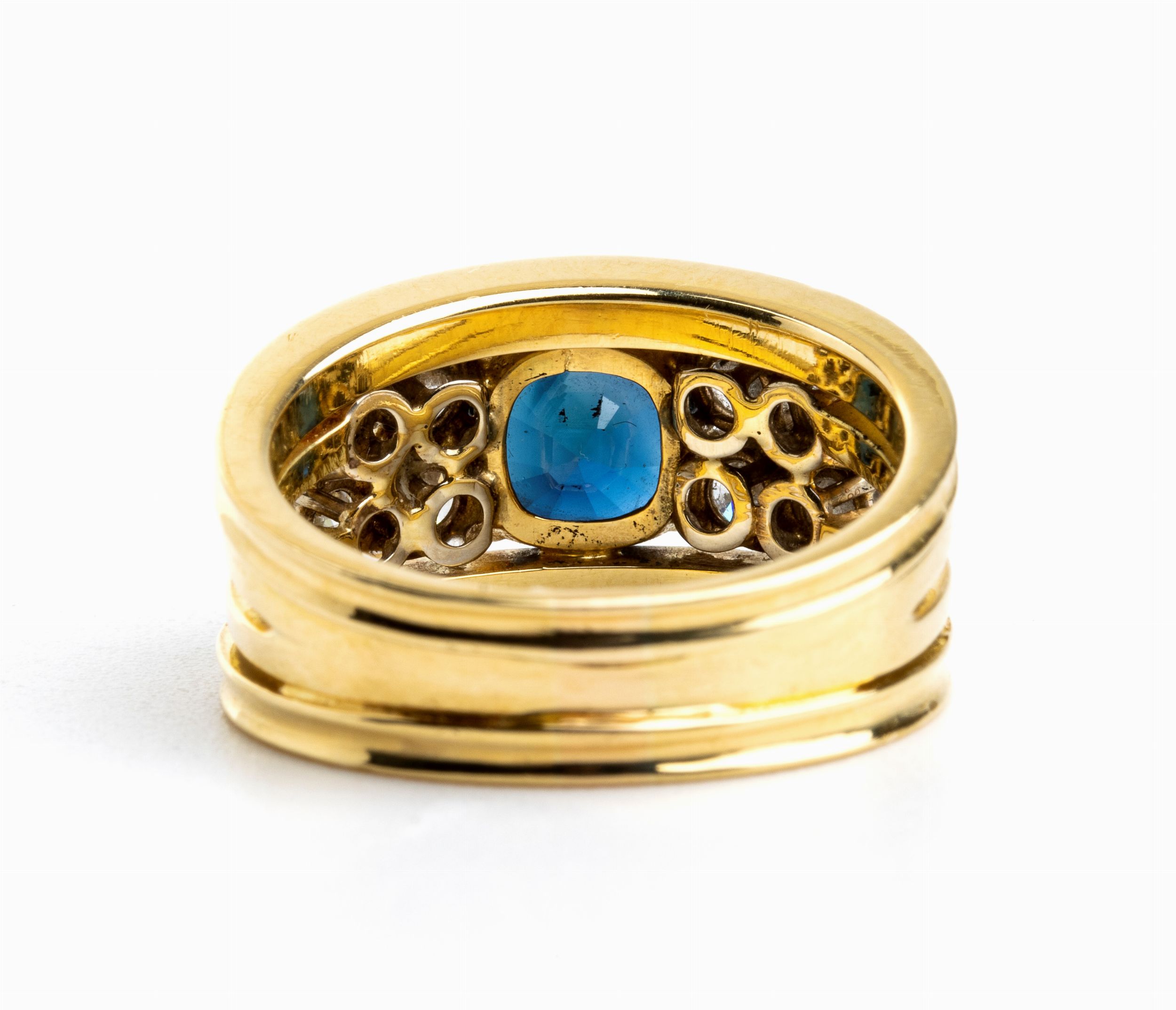 modellato come una fascia, incastonato con zaffiro contornato da diamanti.