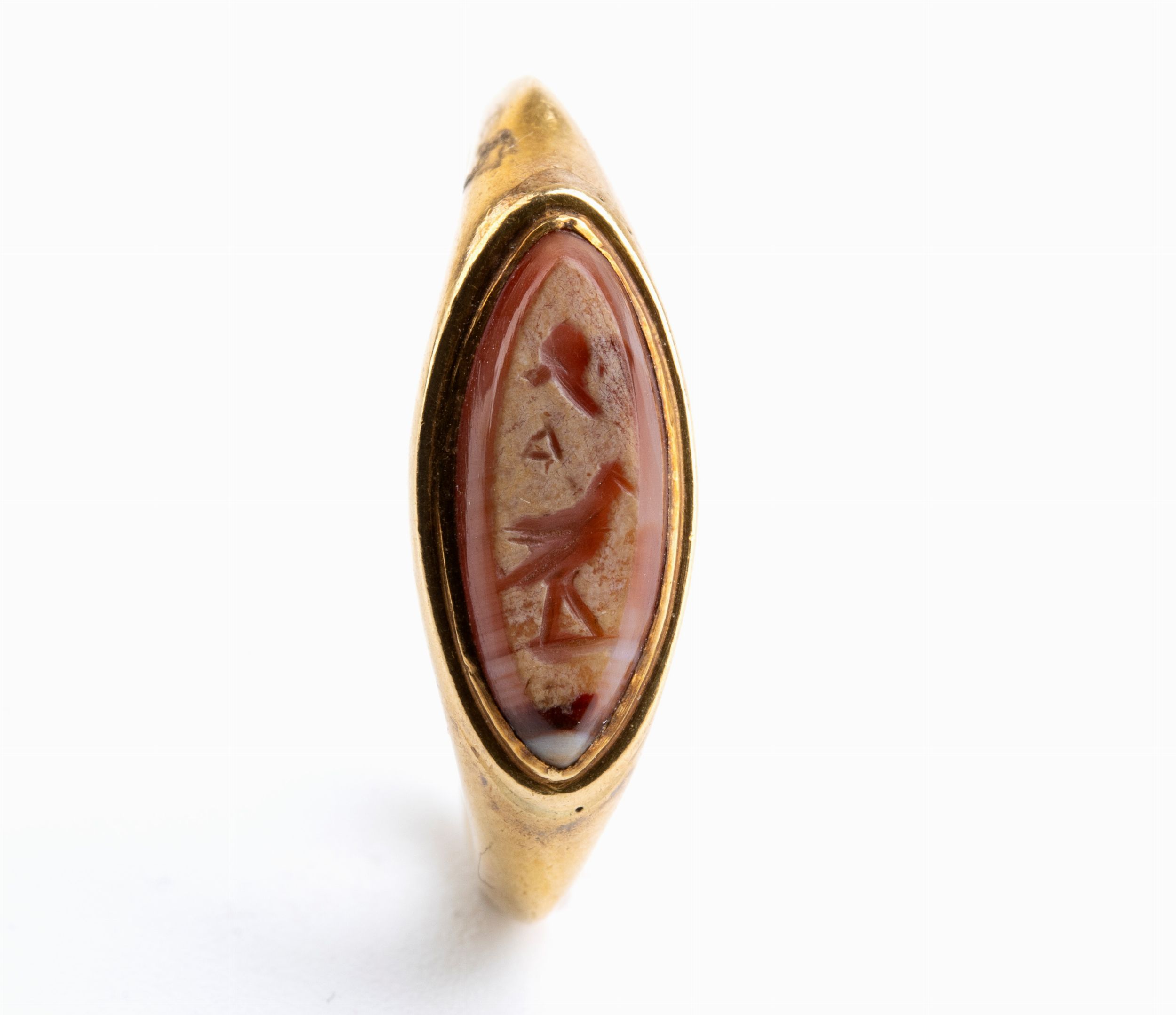 intaglio in corniola di forma ovale raffigurante un pennuto.Misura IT 3 - Misura USA 2 1/2. Peso 5 gr. Stato di conservazione: **** buono.