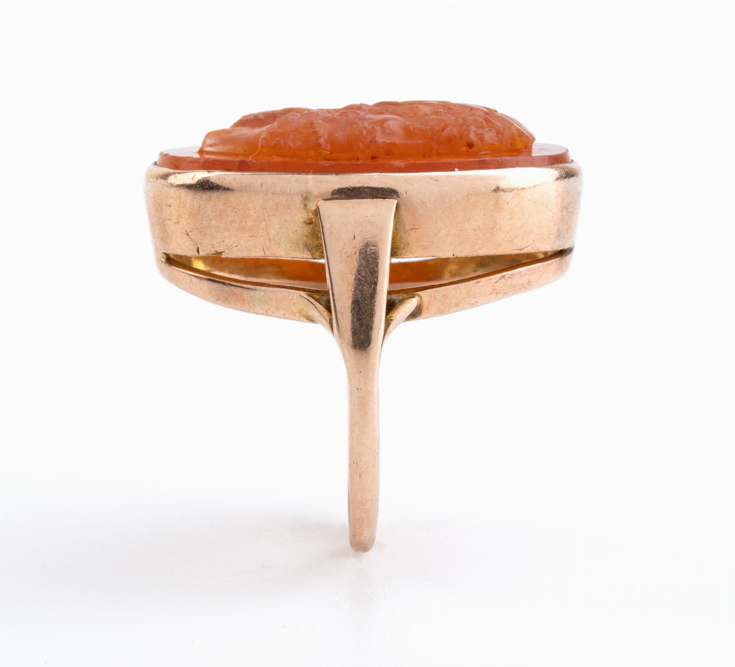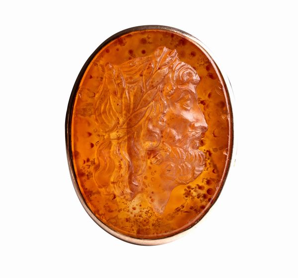 Intaglio in corniola di forma ovale raffigurante un profilo maschile con corona d'alloro.Misura IT 6 - Misura USA 4. Peso 6,8 gr.Stato di conservazione: **** buono.