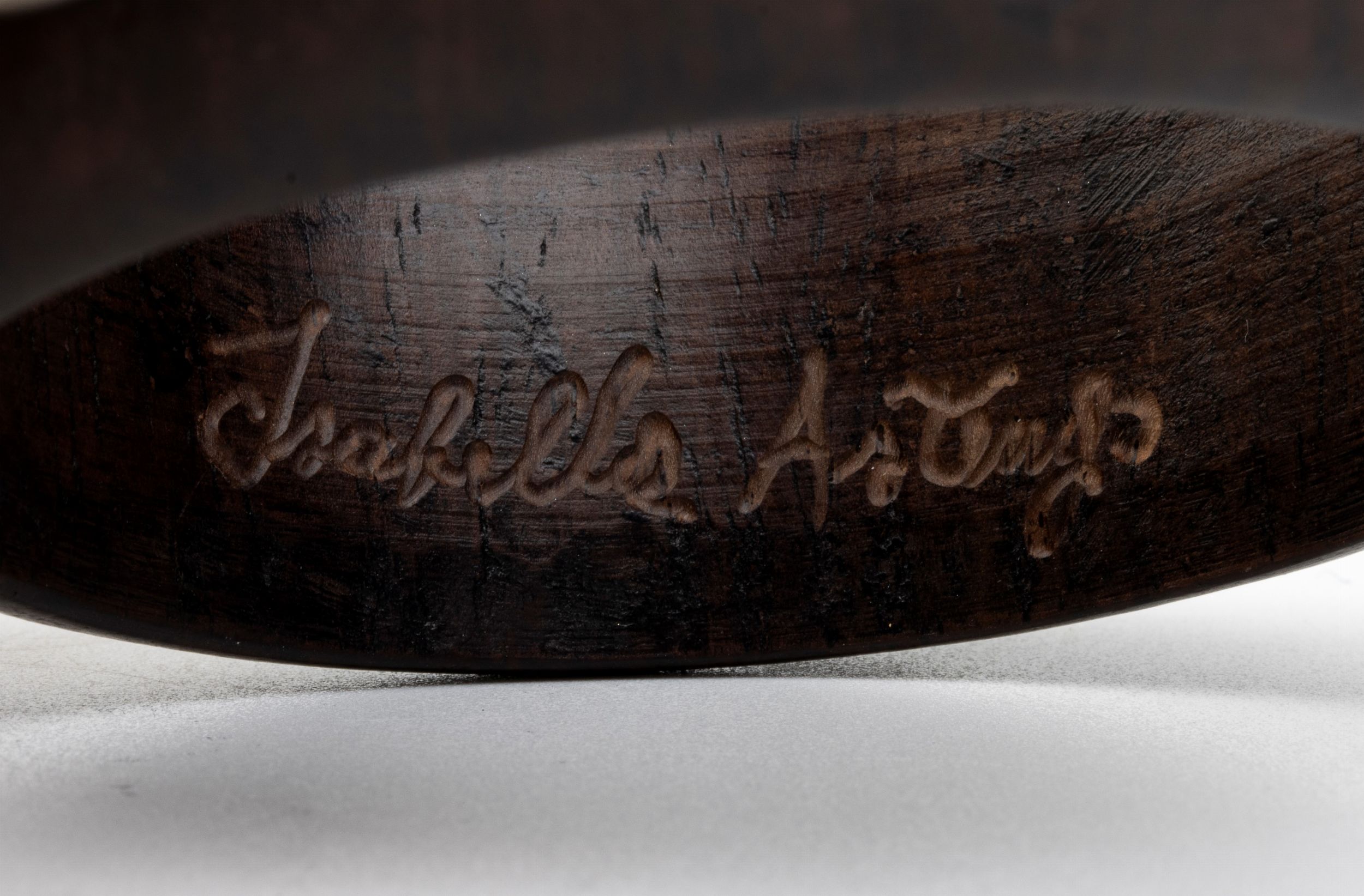 bracciale in legno impreziosito da 5 cabochon di madreperla. Firmato ISABELLA ASTENGO. Diametro intero massimo 7 cm. Altezza 3 cm. Peso 114,7 gr.Stato di conservazione: ***** eccellente.