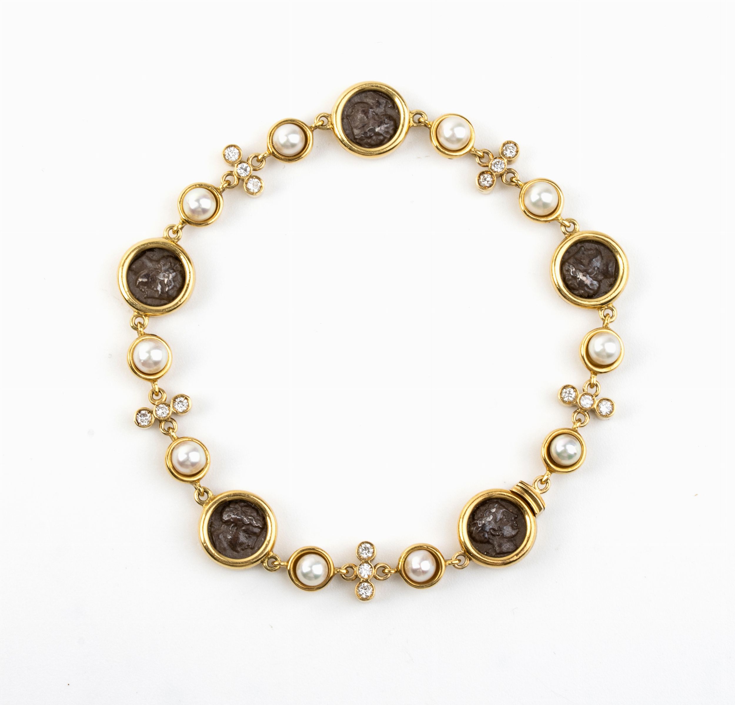 montatura in stile archeologico impreziosita da perle coltivate d'acqua salata, diamanti e monete raffiguranti profili di figure maschili.