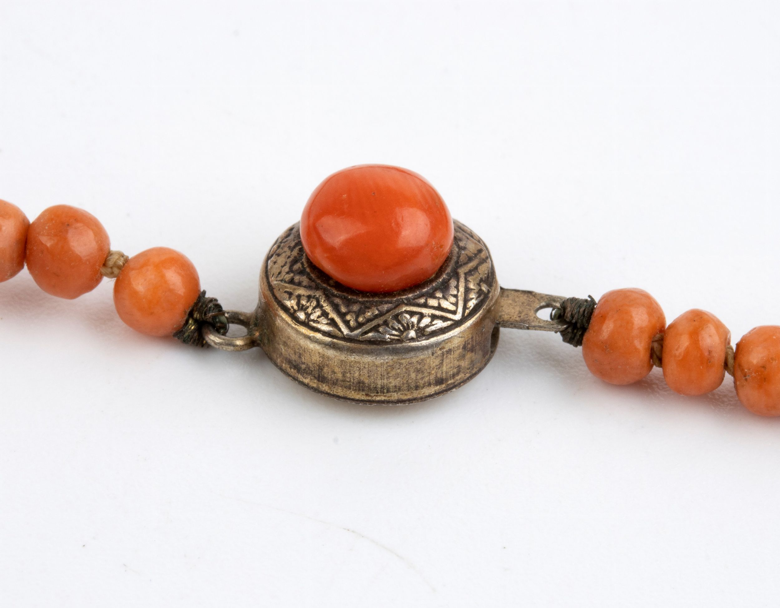 in argento 800/1000, con sfere di corallo Cerasuolo (corallium elatius) disposte in gradazione e di diametro 6,5 - 10 mm.Punzonato 800. Lunghezza 64 cm. Peso 29 gr.Stato di conservazione: **** buono.