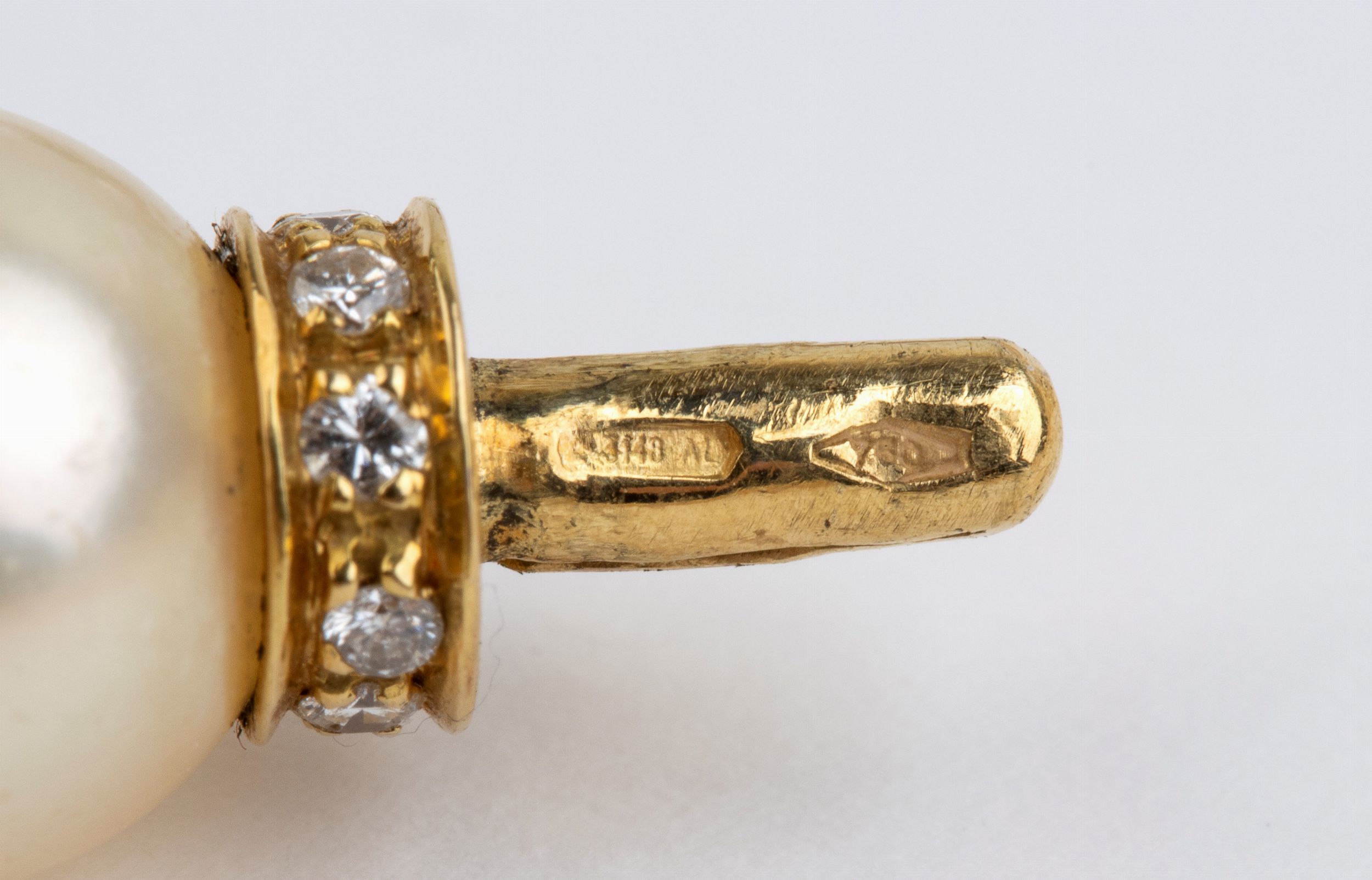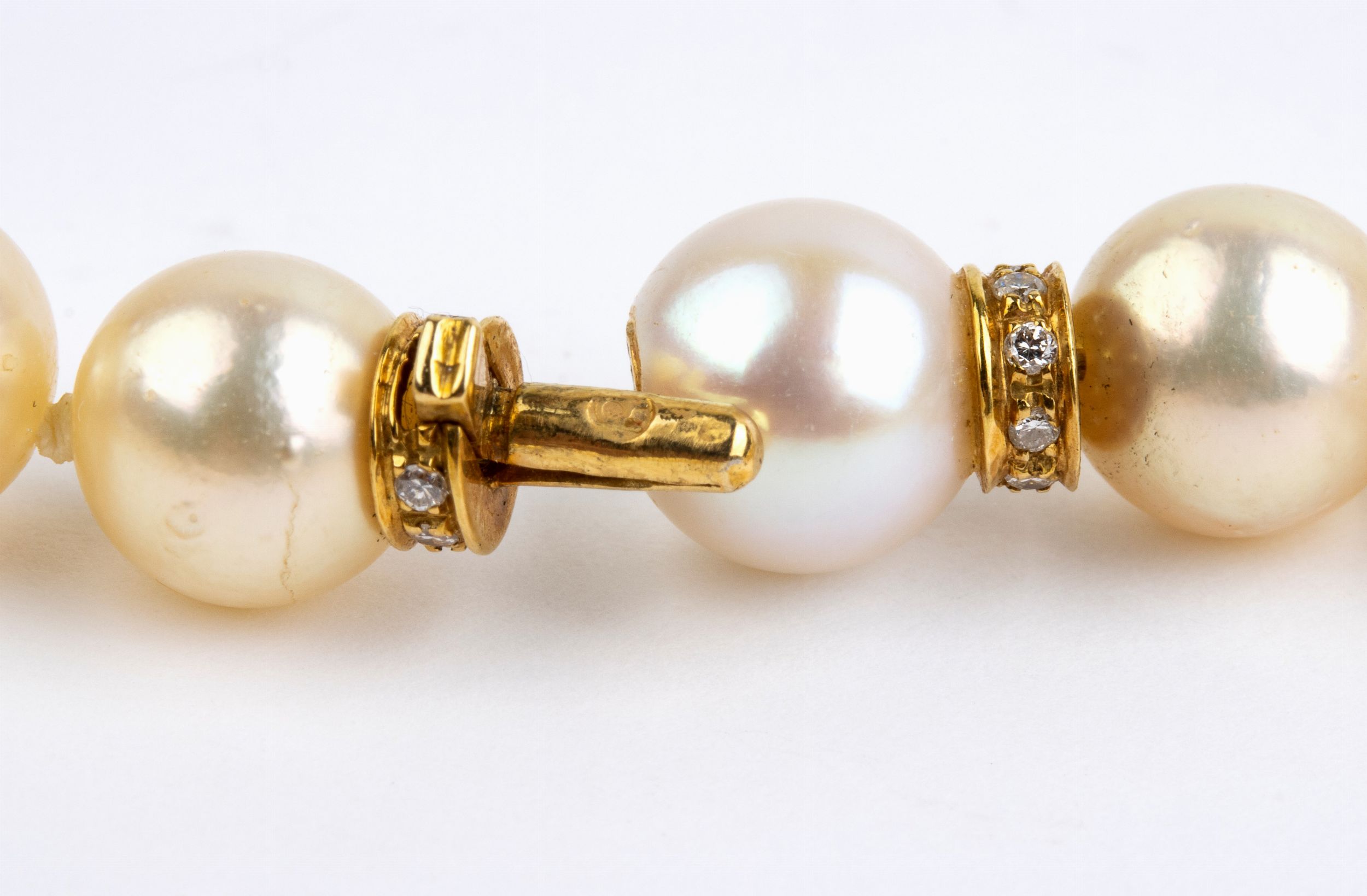 ad un filo di perle coltivate d'acqua salata, chiusura in oro giallo, dettagli in diamanti.