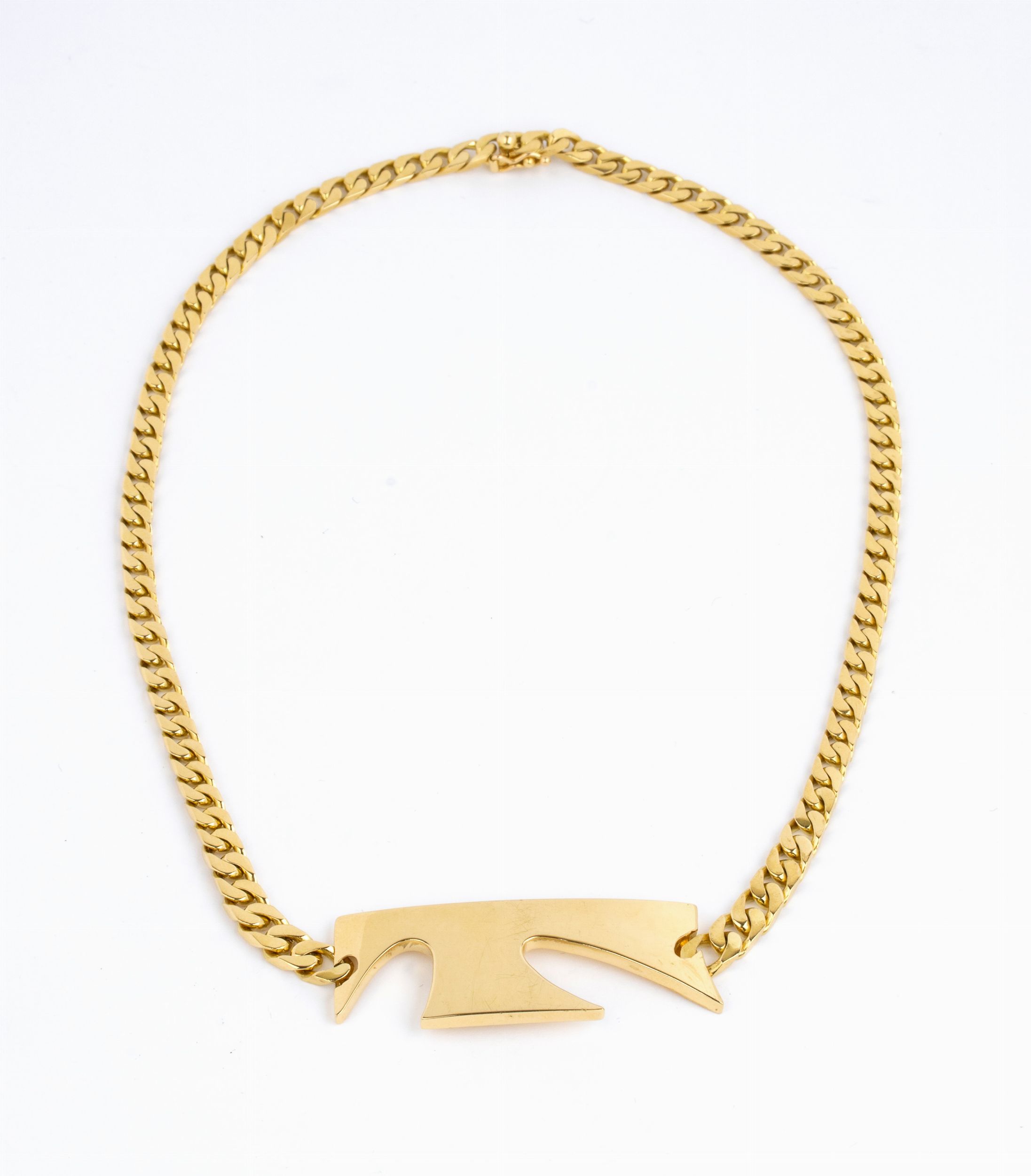 catena a maglia grumetta con pendente centrale, in oro giallo 18k. Firmato BULGARI.Punzonato 750 - BVLGARI - ROMA. Lunghezza 37,3 cm. Dimensioni pendente 4,6 x 1,7 cm. Peso 43,4 gr.Stato di conservazione: ***** eccellente.