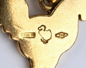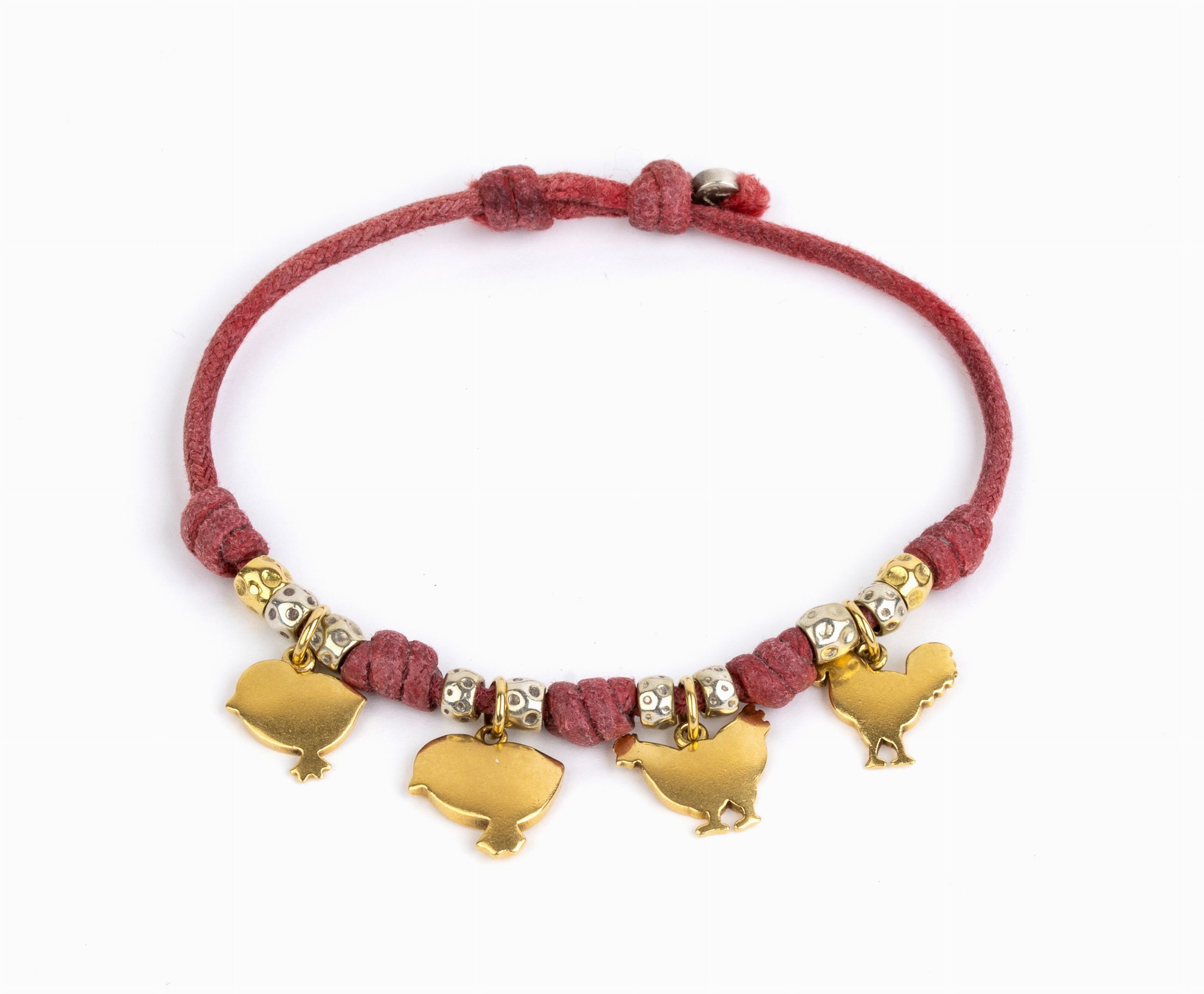 bracciale con pepite in argento e pendenti in oro giallo 18k. Punzonato 750 - 1464 MI - simbolo Dodo. Diametro interno 6,3 cm. Peso 13,5 gr. Stato di conservazione: **** buono, segni di utilizzo nel tempo.