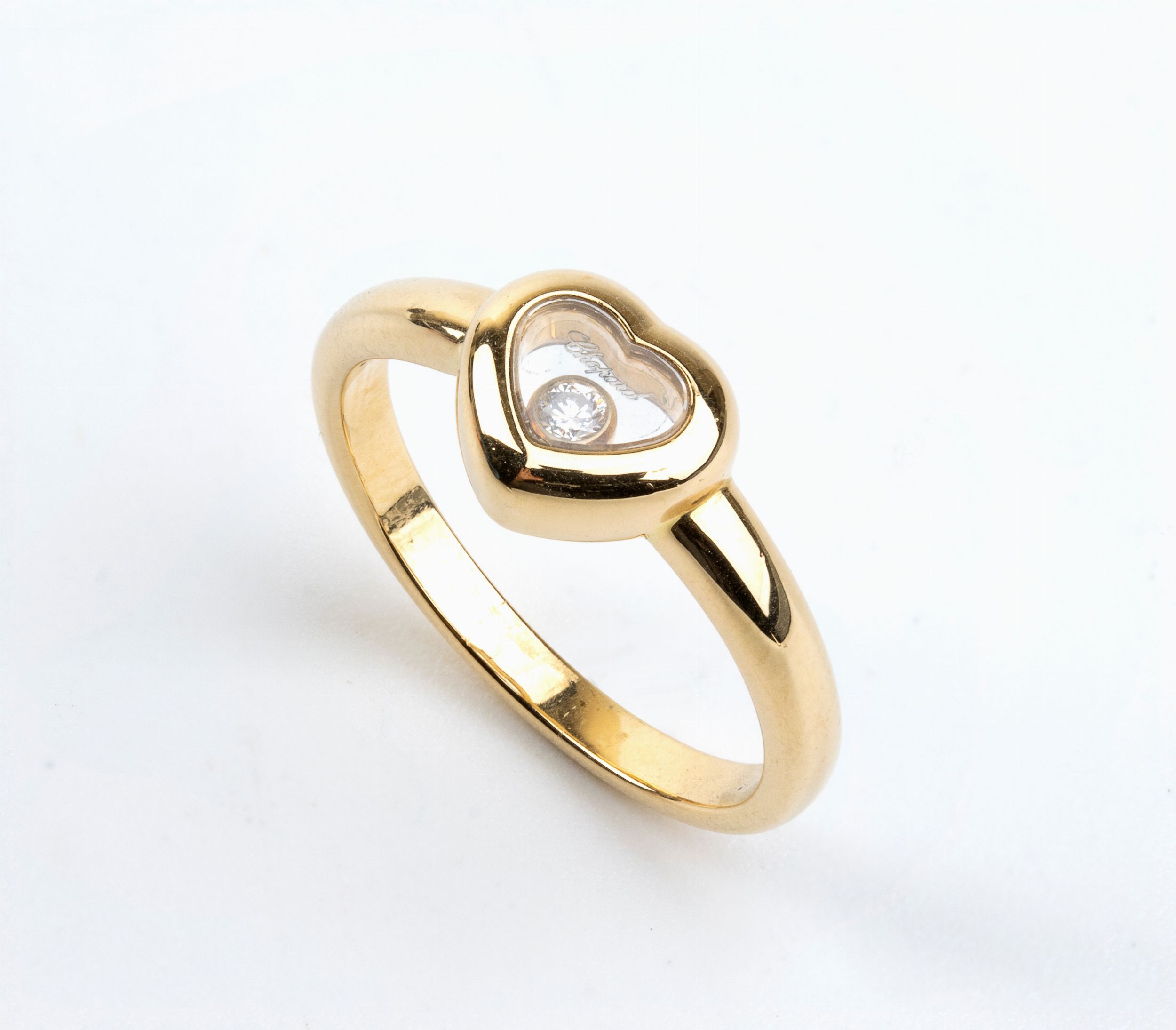 in oro giallo 18k a forma di cuore con diamante. Punzonato 750 - CHOPARD - 6213610 - 824864-0111. Misura IT 15 - Misura USA 7 1/2. Peso 4,6 gr.Stato di conservazione: **** buono.