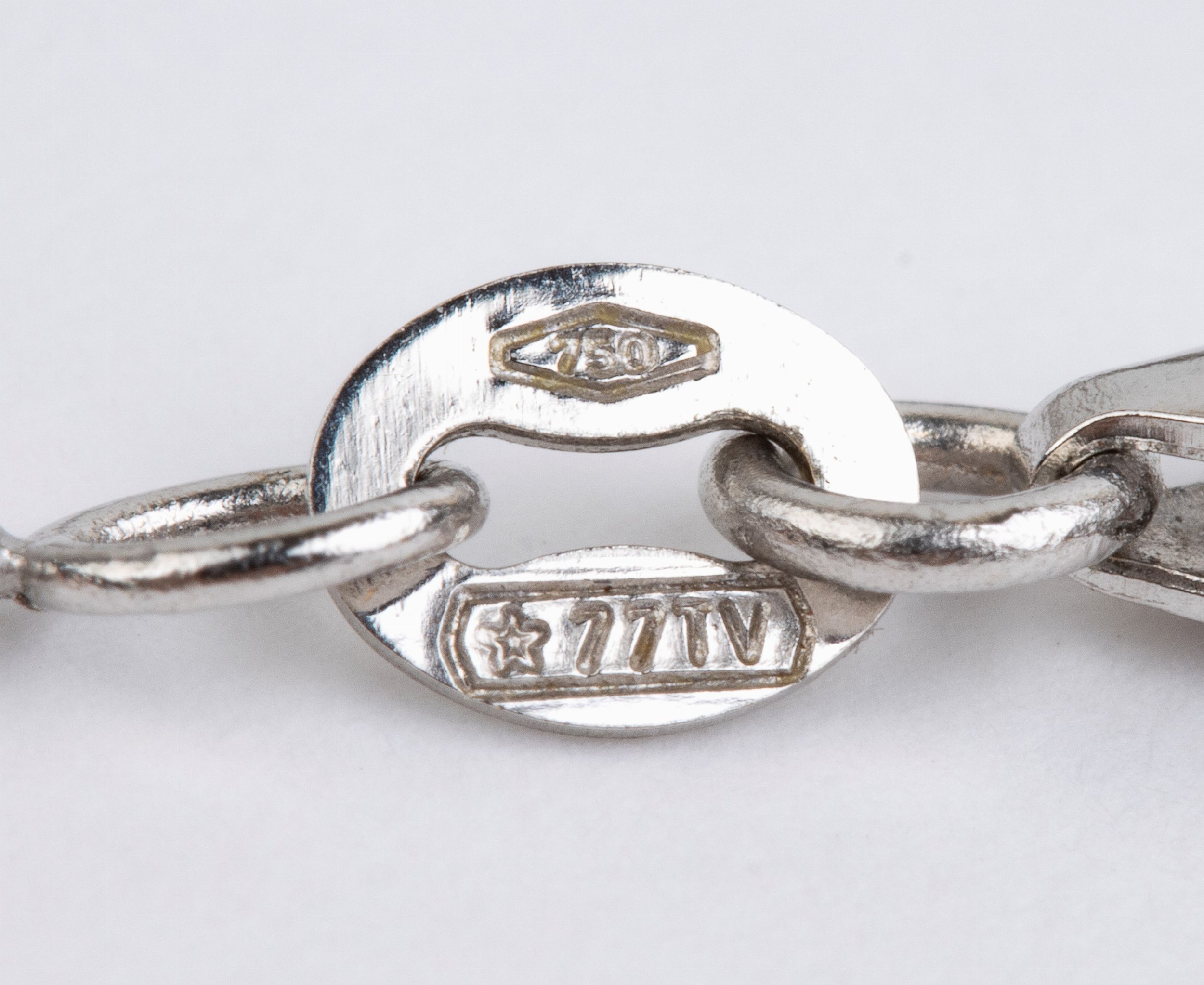 Punzonato 750 - 27 TV. Lunghezza catena 45 cm. Dimensioni pendente 2,5 x 1,3 cm. Peso complessivo 6,5 gr.